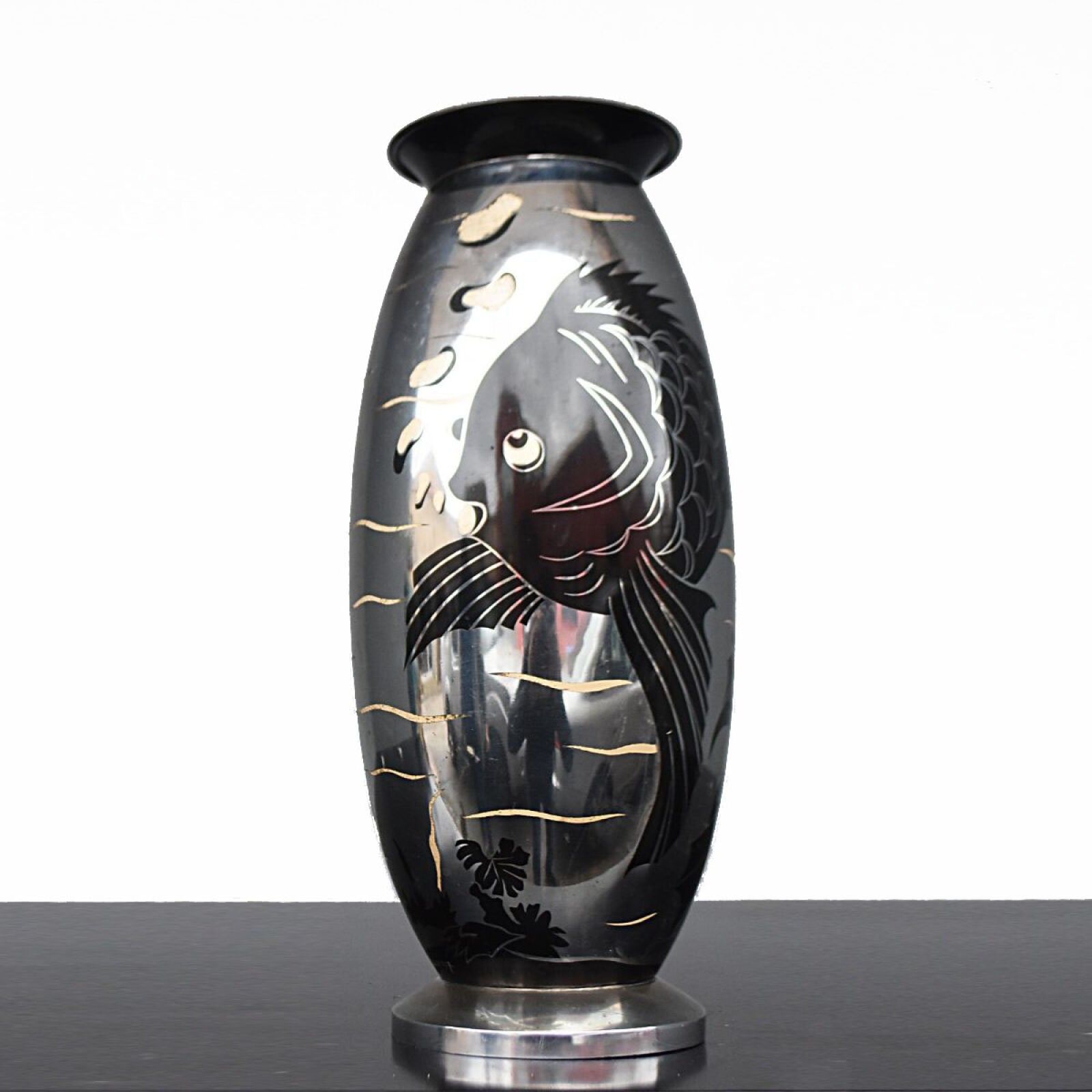 Lucien GERFAUX (1882 - 1972) Lampe Art Déco en dinanderie à décor de poisson 40 x 17 cm (manque le système électrique)