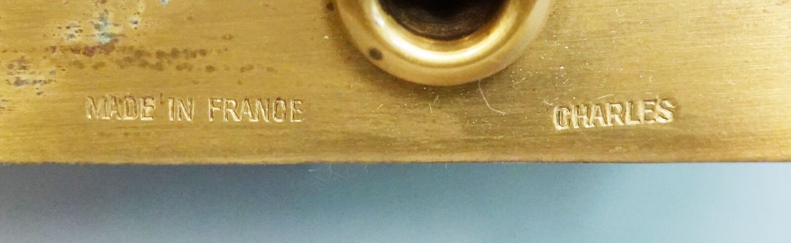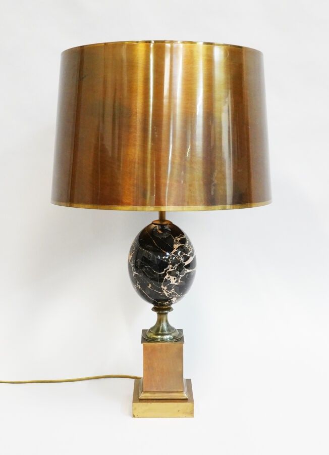 Lampe « œuf » à base à gradin en laiton, fût en laiton à décor d'un œuf en marbre noir veiné, abat-jour circulaire en laiton, signée sur le pied MADE IN France CHARLES