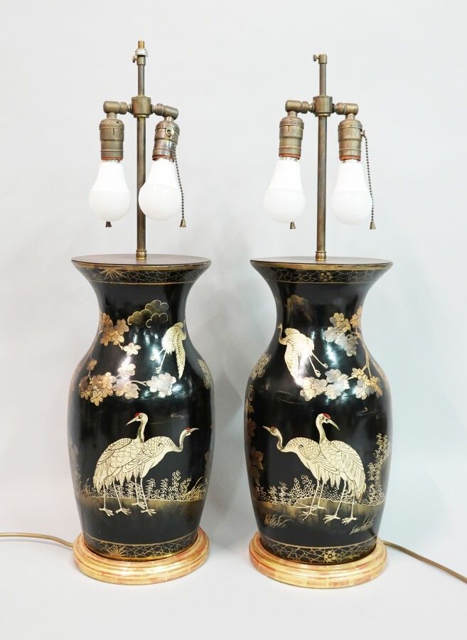 Paire de lampes de forme balustre en carton bouilli à décor dans le goût chinois d'oiseaux sur fond noir Hauteur : 44 cm