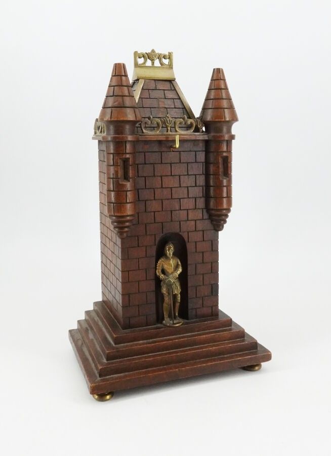Porte-montre style Viollet-le-Duc en bois sculpté en forme de tour de garde avec son garde en bronze Hauteur : 28 cm