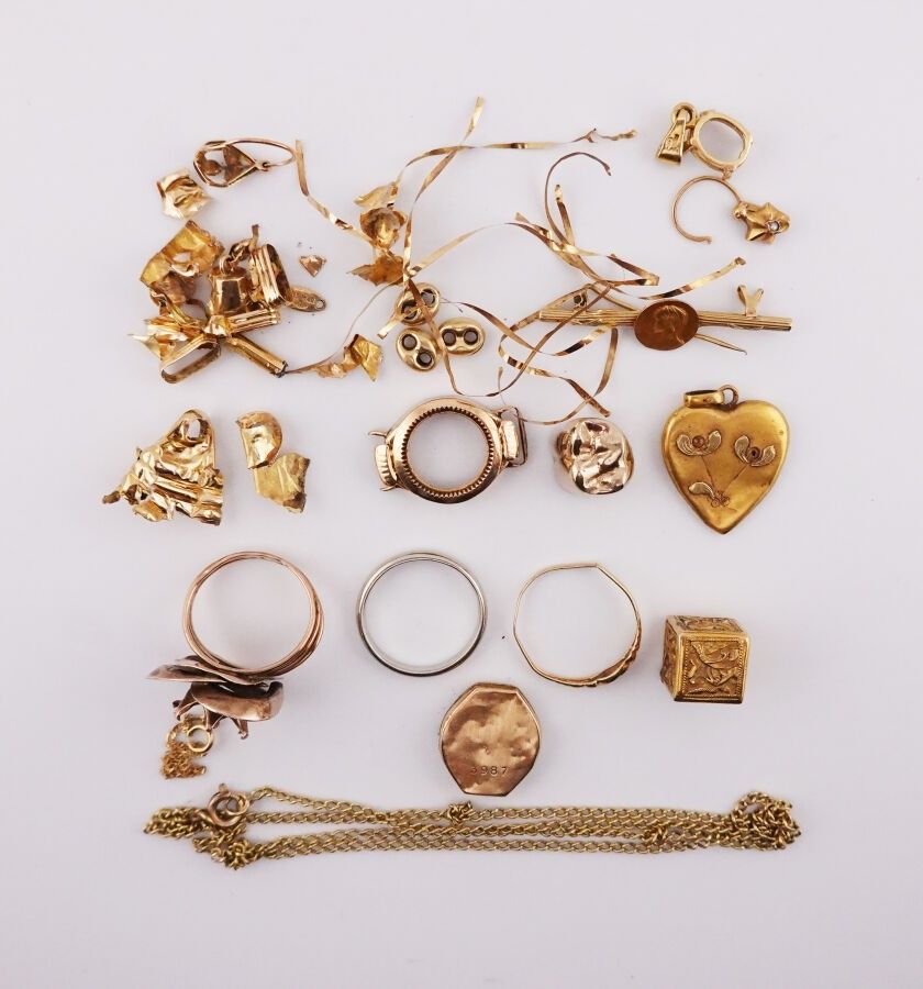 Vrac d'or : chaîne, boîtier de montre, montures de bague, br…