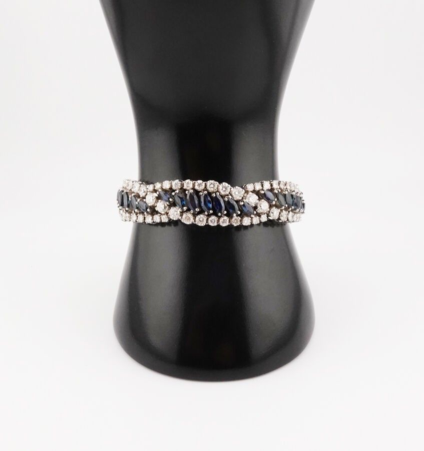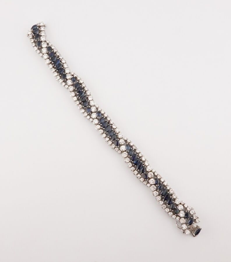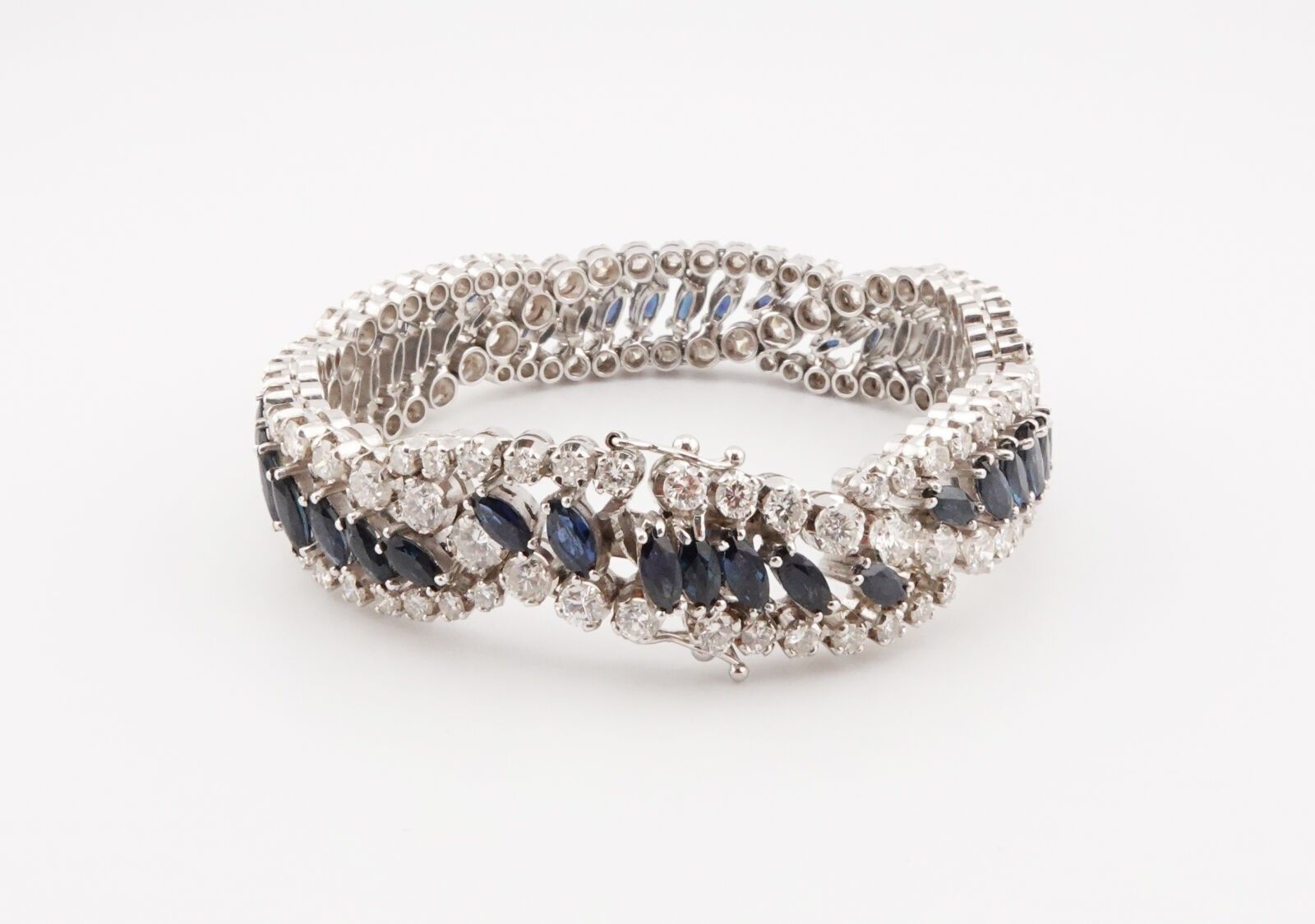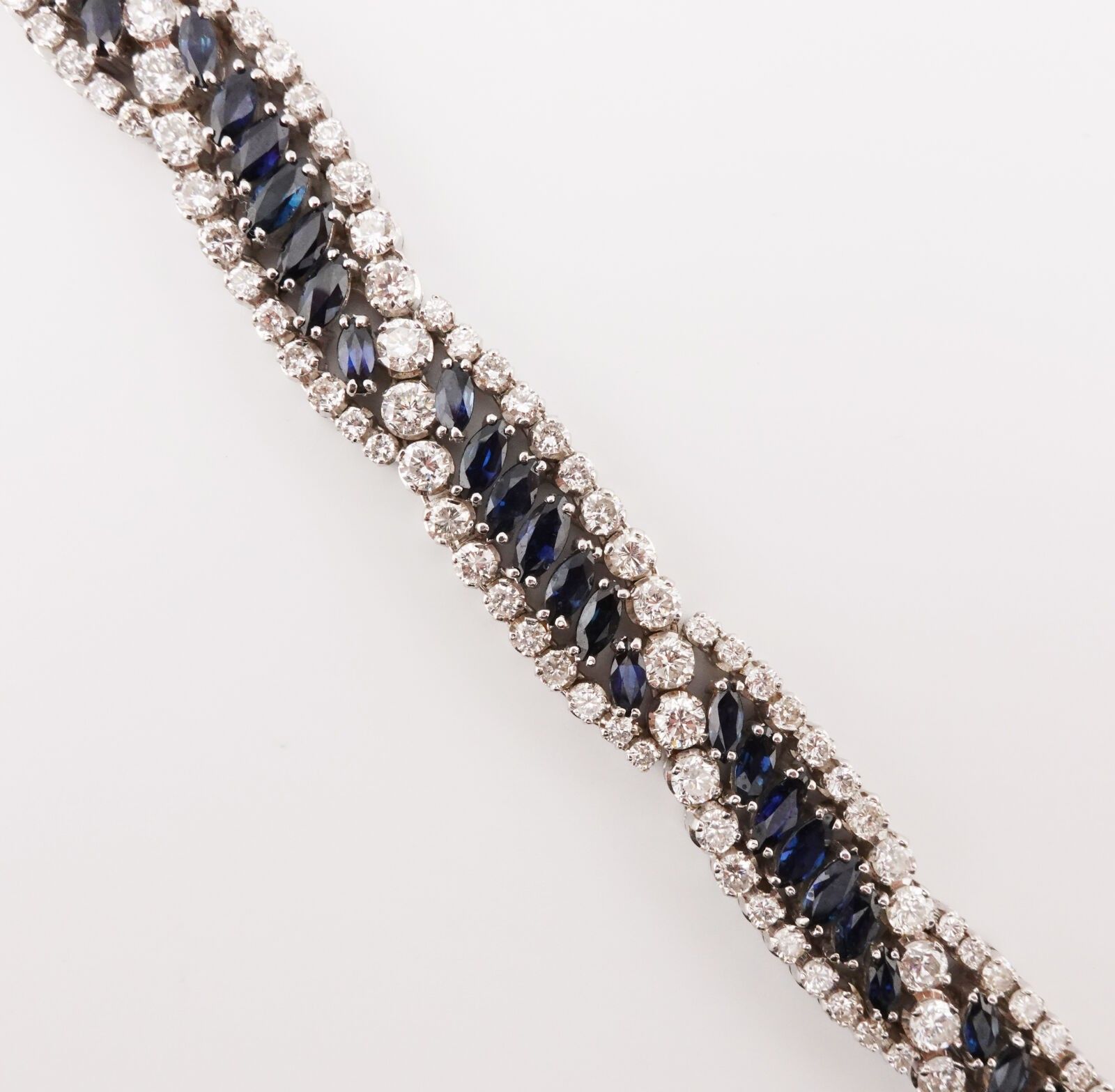 Important bracelet en or blanc richement serti à la façon d'un ruban torsadé de saphirs taille marquise et diamants taille brillant
