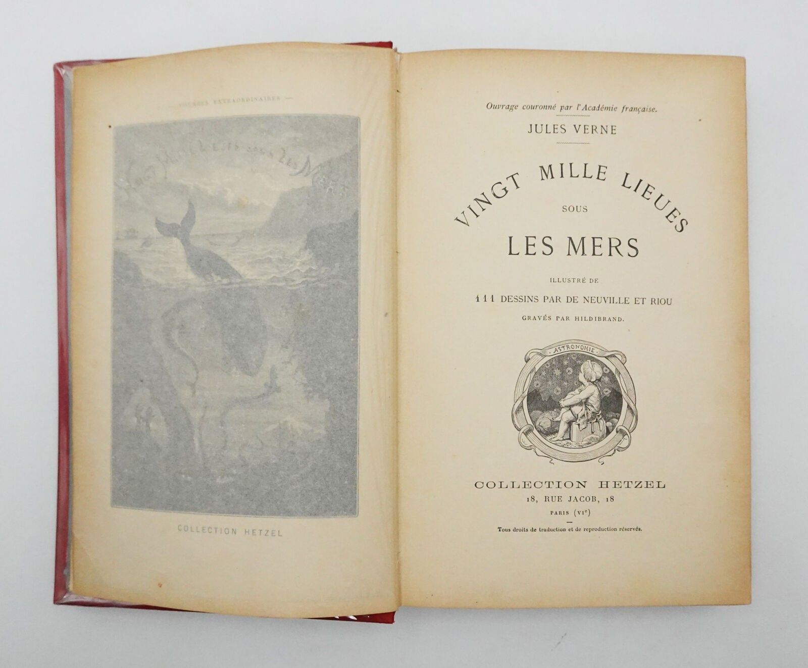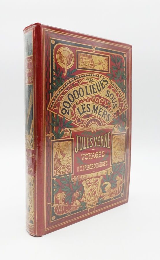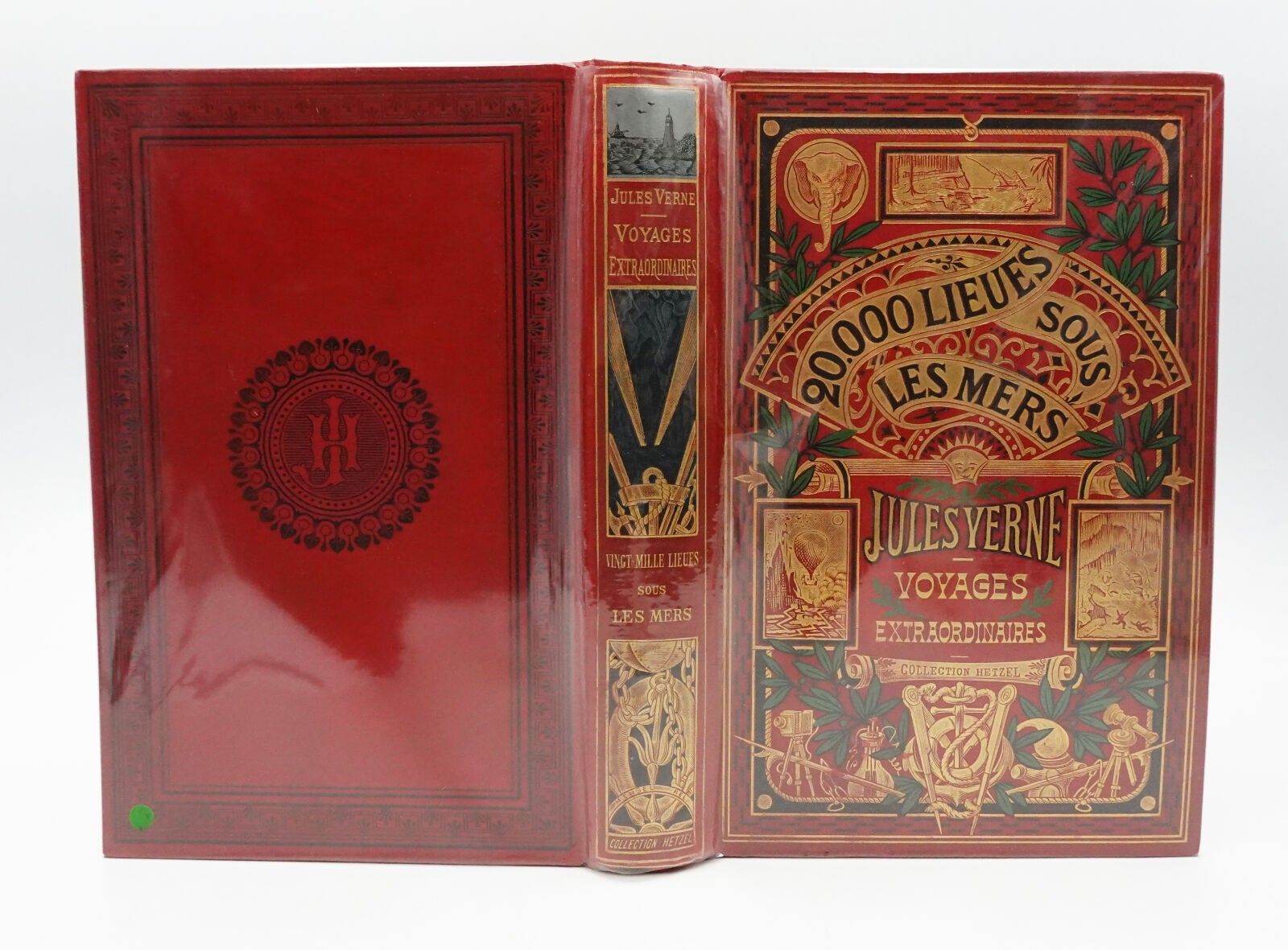 Jules VERNE. Voyages Extraordinaires. 20.000 Lieues sous les mers. Collection HETZEL Cartonnage percaline éditeur rouge un éléphant et éventail, dos au phare