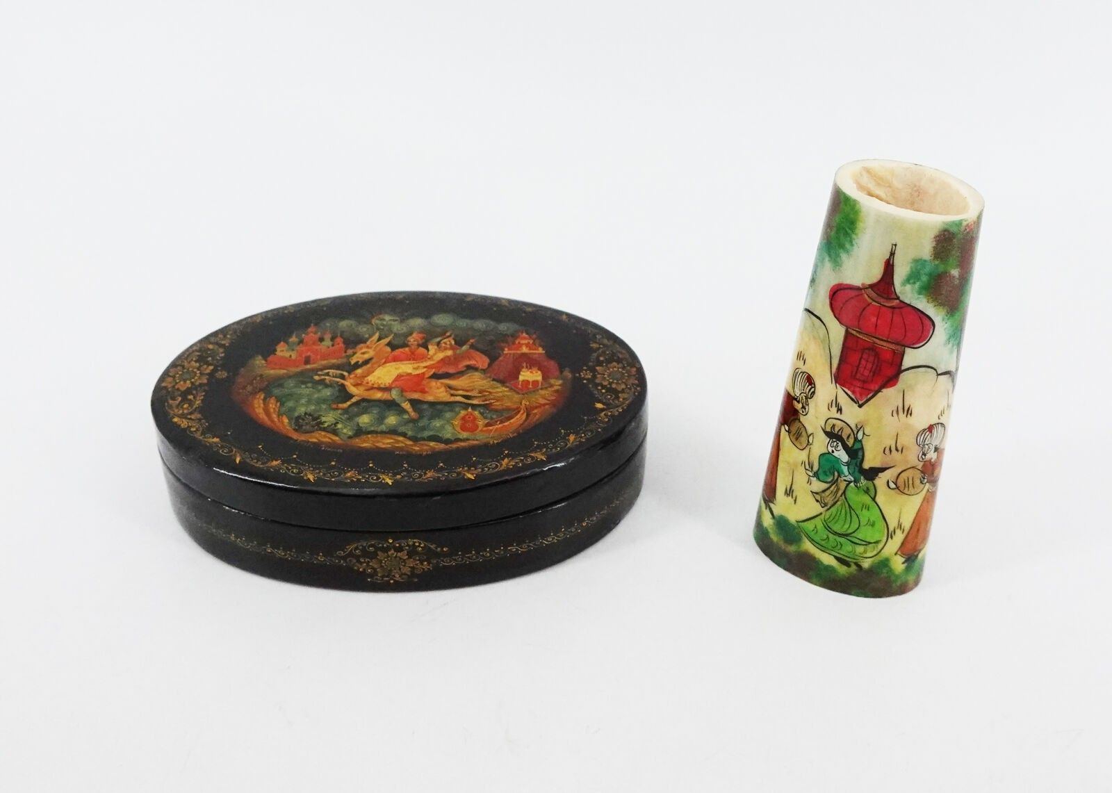 IRAN Lot composé d'une boîte en bois laqué et un manche en os Le plus grand : 14 cm