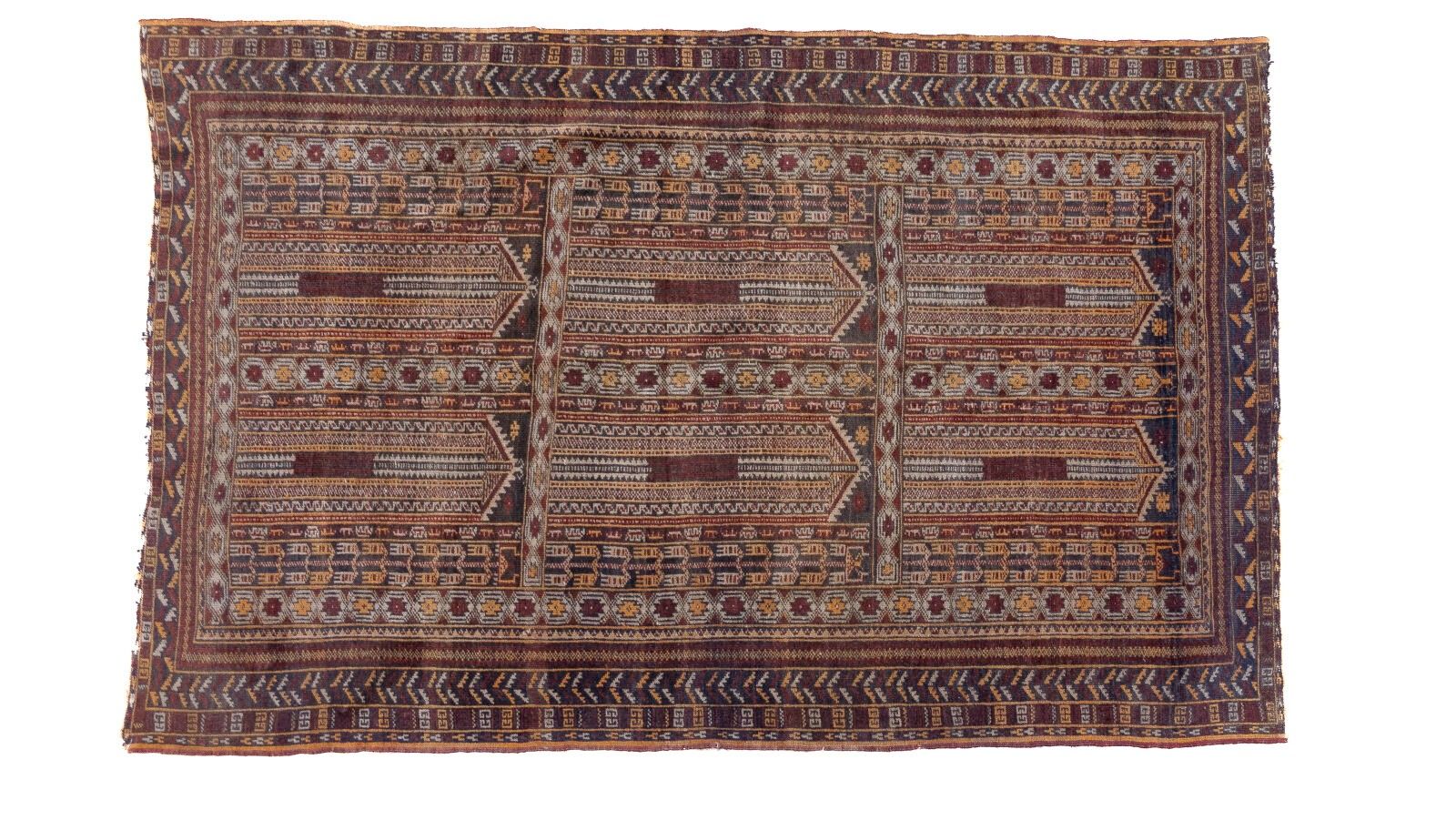 Tapis afghan beloutche à décor de caissons ornés de mihrab 197 x 123 cm (usures au franges)