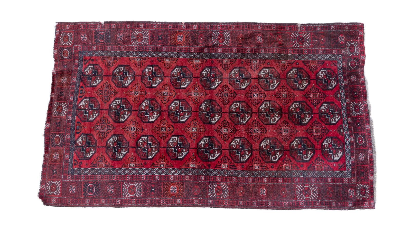 Tapis persan beloutche à fond rouge orné de trois rangées de neuf güls 208 x 120 cm (lisières abimées)