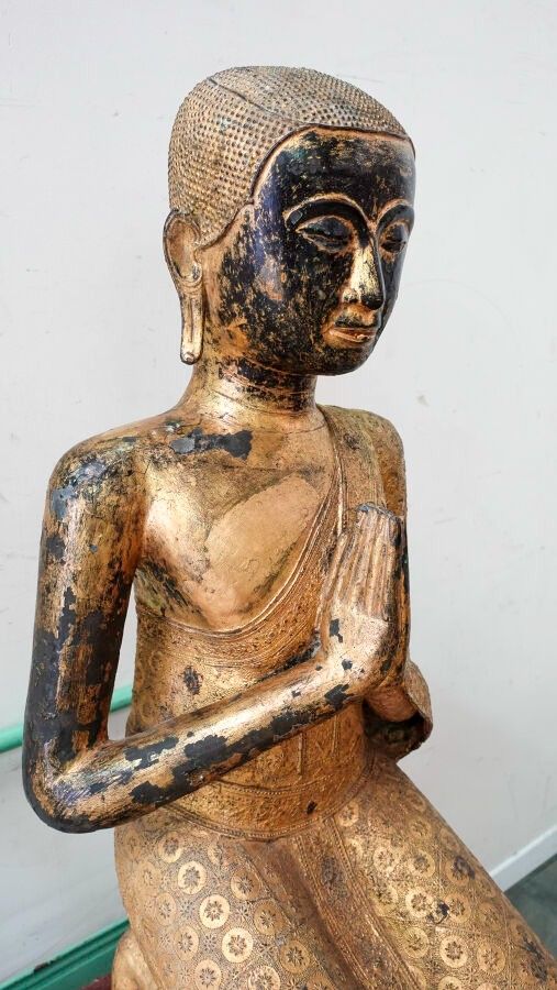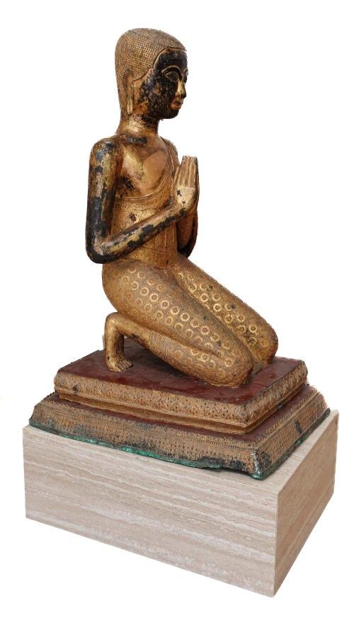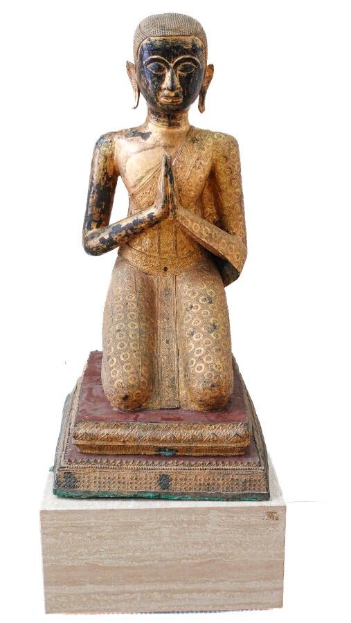 Grand sujet en bronze doré à la feuille sur fond laqué noir, représentant un adorant agenouillé sur une base quadrangulaire à deux niveaux ouvragés laqués rouge et doré, les mains en anjali, son vêtement monastique richement orné. Socle en pierre marbrière
