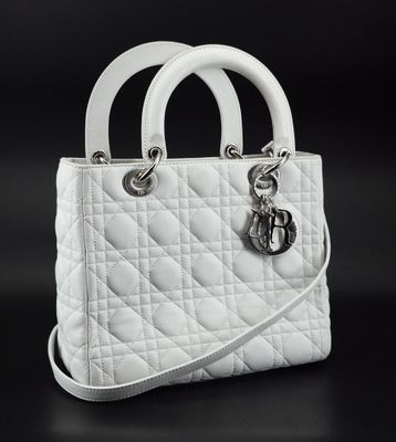 CHRISTIAN DIOR « Lady Dior » MM Sac à main en cuir blanc à s…