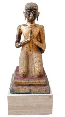 THAILANDE Moine en bronze doré assis en position de prière, …