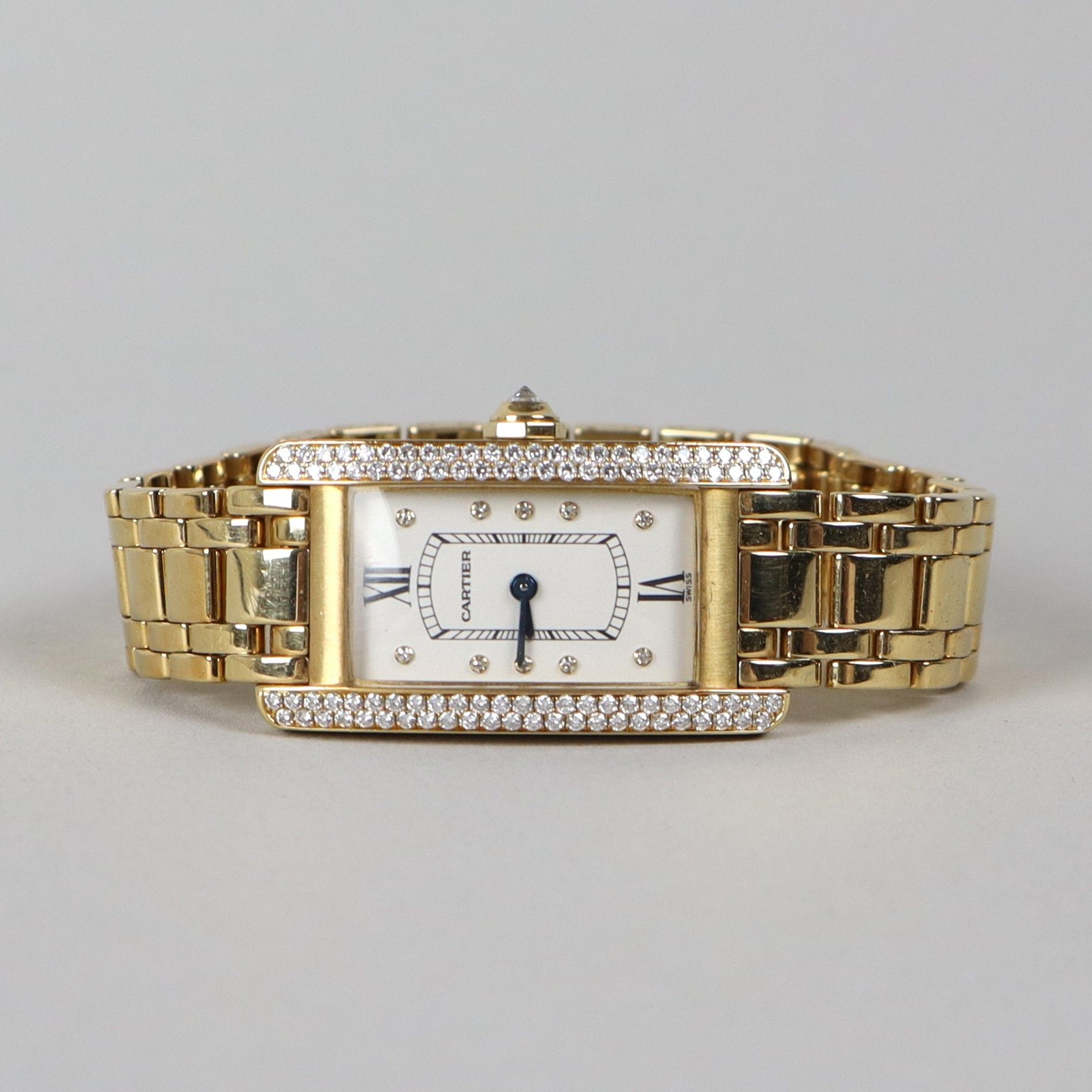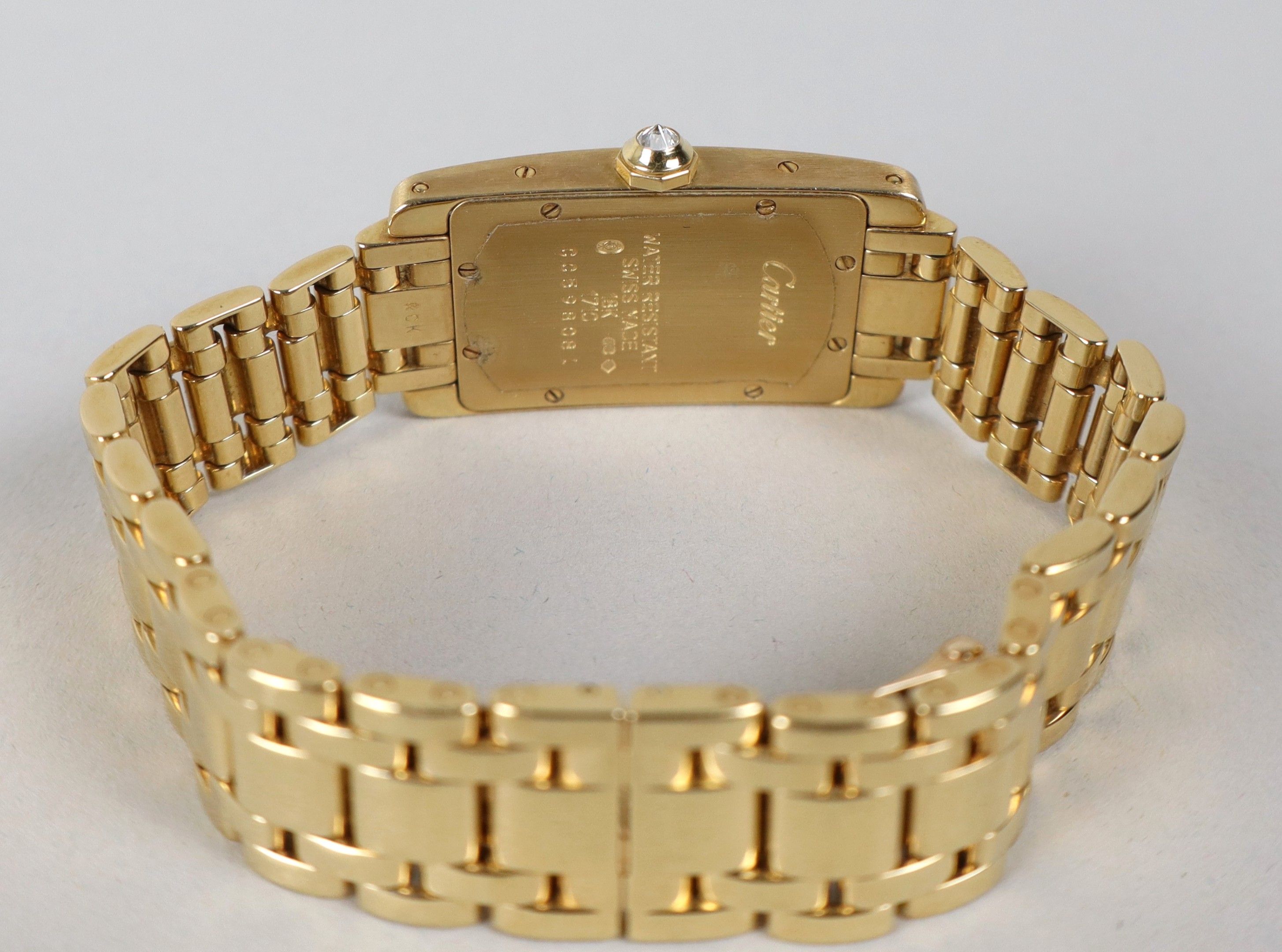 CARTIER, Paris. Montre bracelet de dame tout or jaune (750/00), modèle "Tank Américaine" ; boîtier rectangulaire avec fond vissé (35 x 19 mm, hors couronne), serti de petits diamants ; bracelet avec boucle déployante ; cadran crème avec minuterie chemin de fer et index chiffres romains, orné de dix diamants ; aiguilles "glaives" bleuies ; couronne sertie d'un diamant ; mouvement à quartz (pile changée). P. brut = 78,5 g. Vendue sans boîte ni papiers. (micro-rayures d'usage)