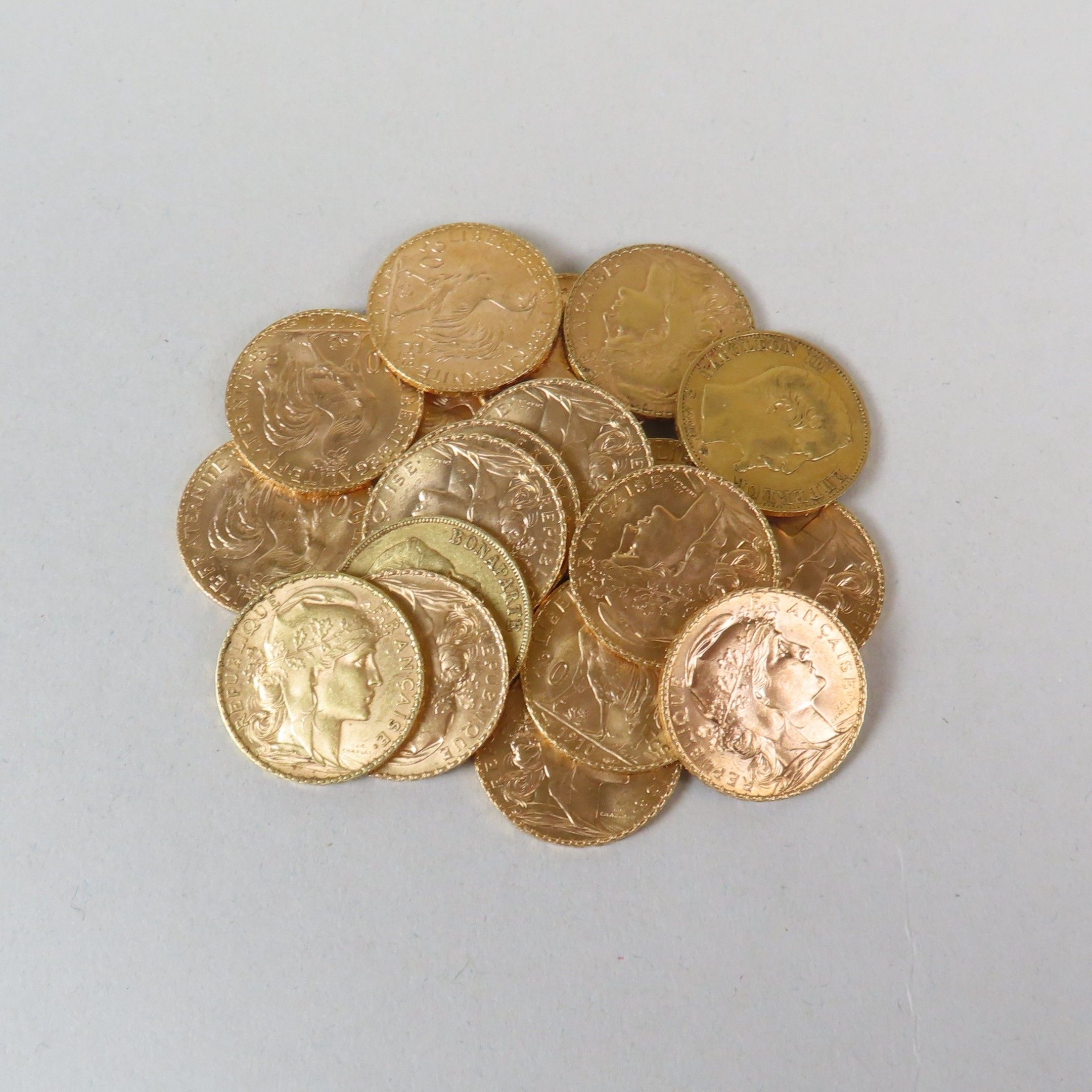 Dix-neuf (19) pièces de 20 F or France : 17 x 20 F "Marianne" + 2 x 20 F "Napoléon III". (usures)