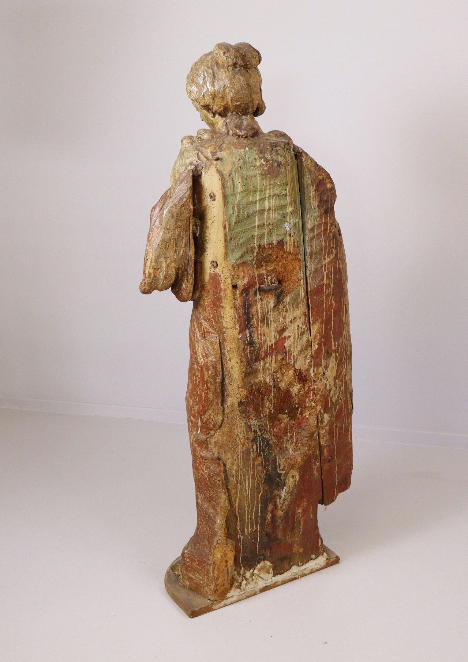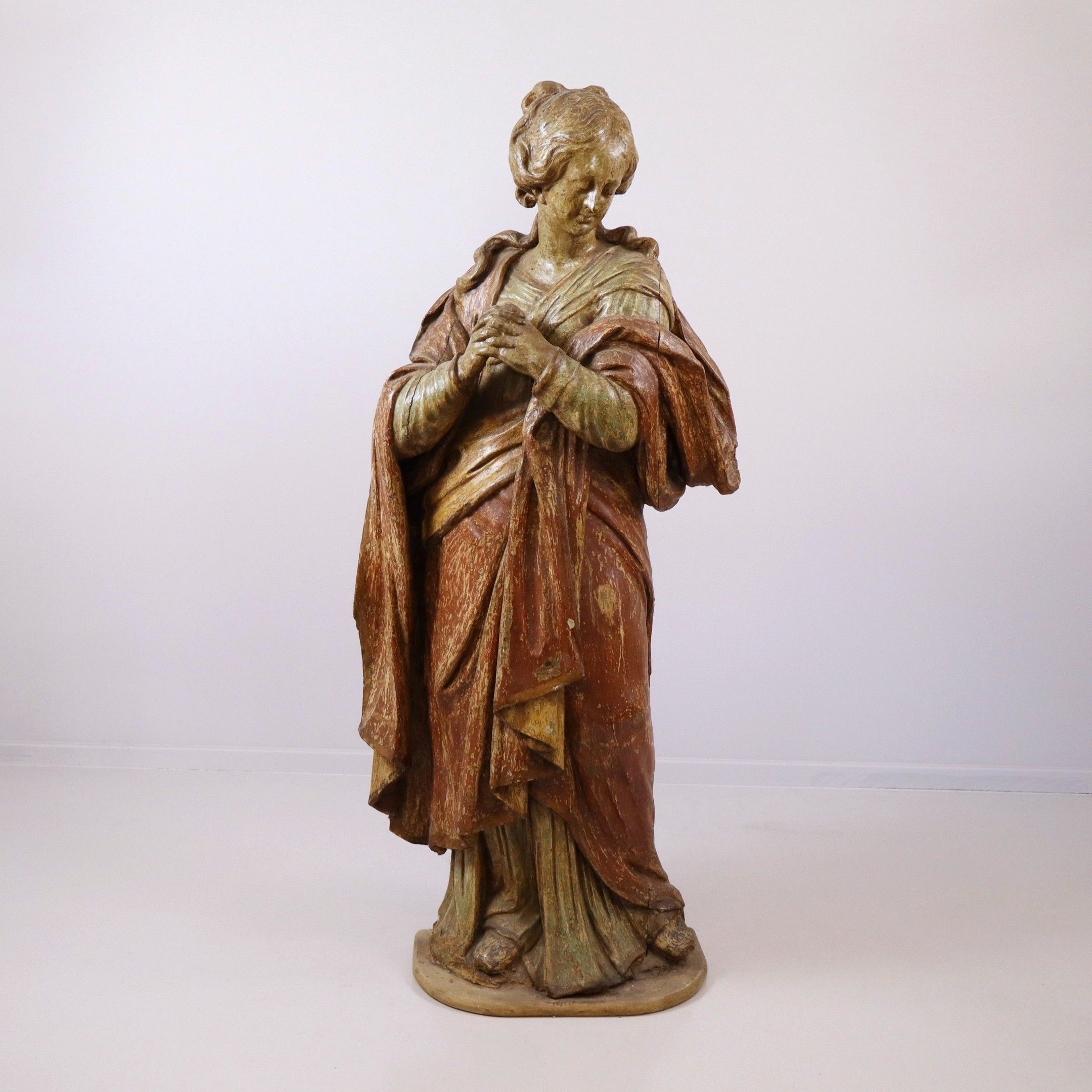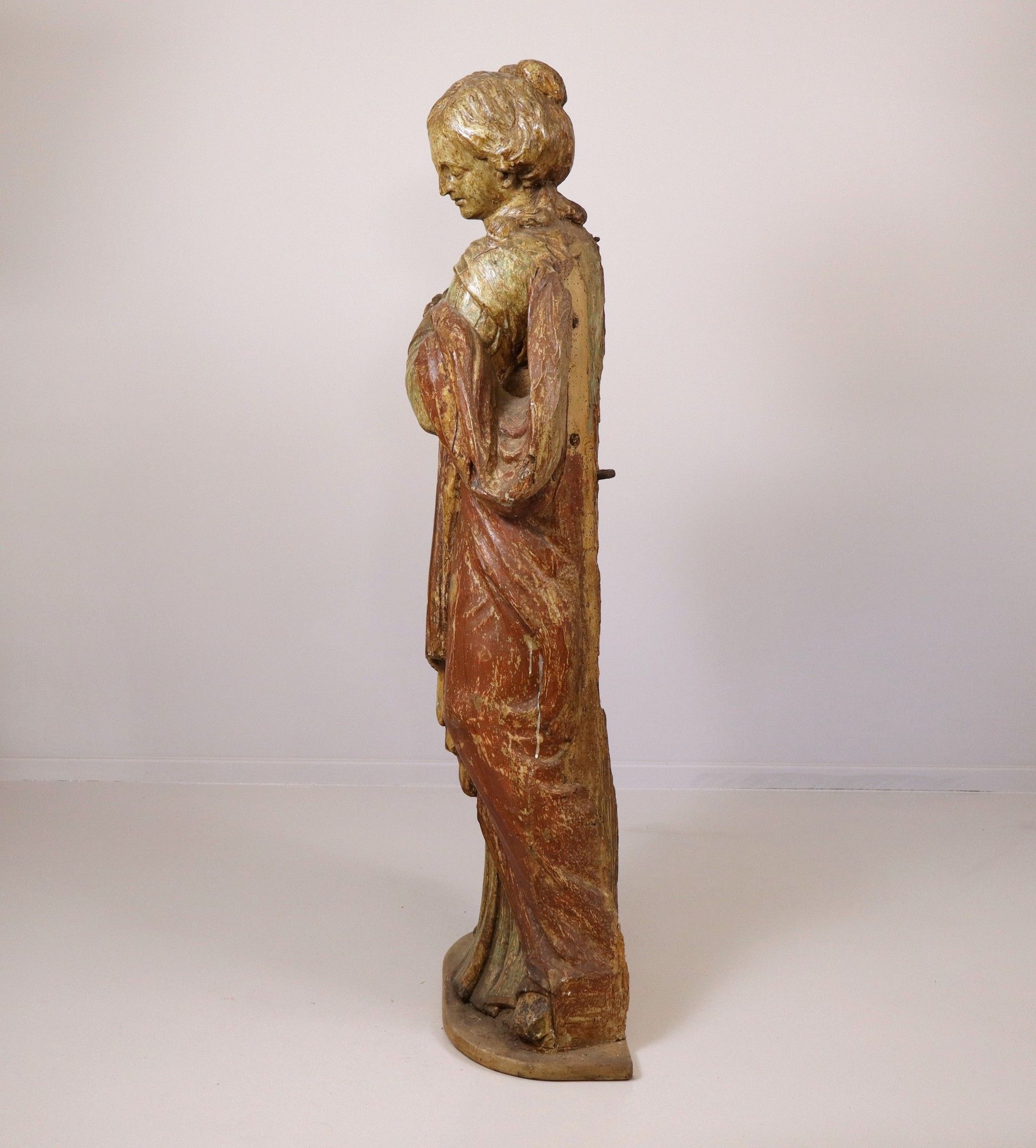 Importante sculpture en bois polychrome, figurant une Sainte Femme. XVIIe. Haut. 139 cm. (usures ; petits manques et trous de vers xylophages)
