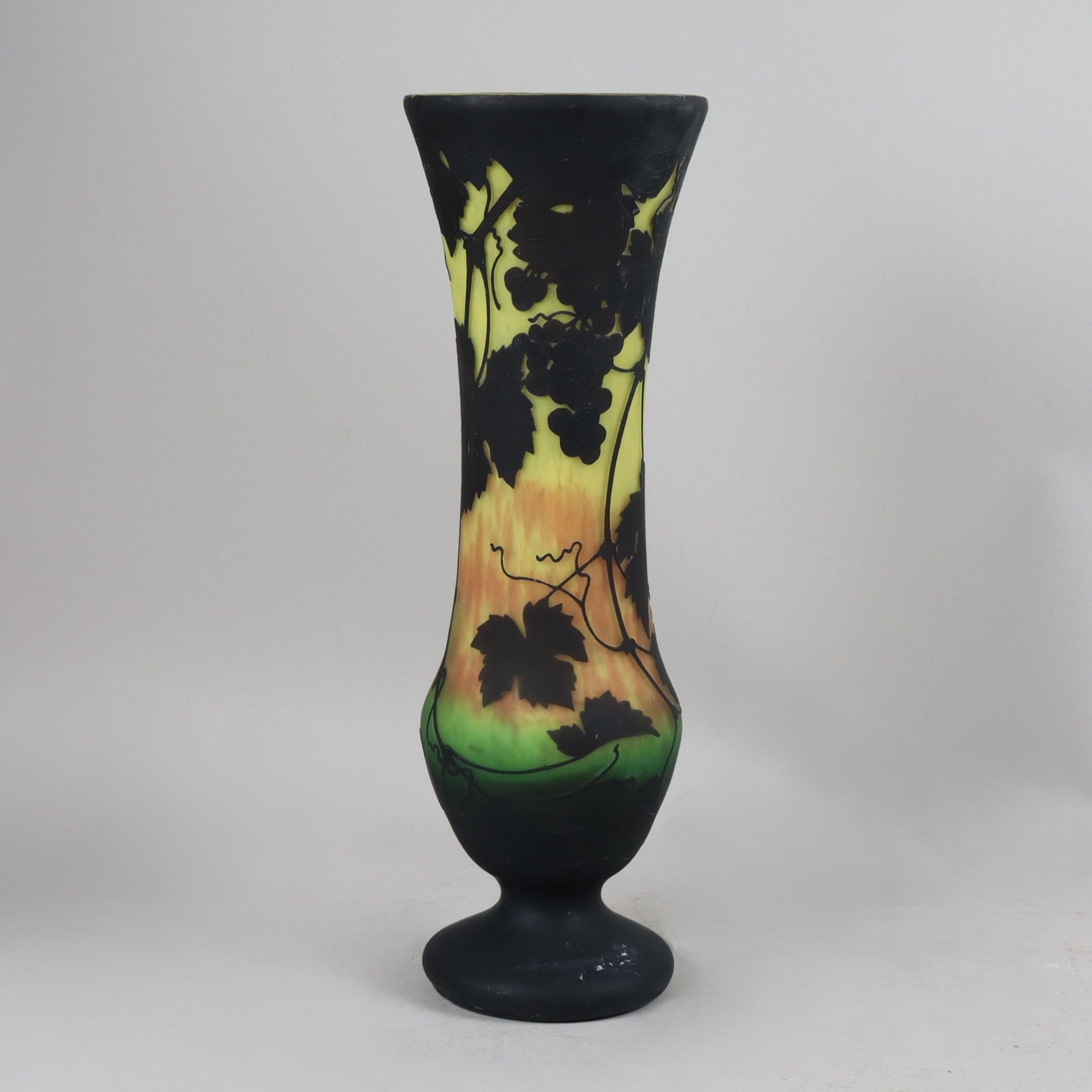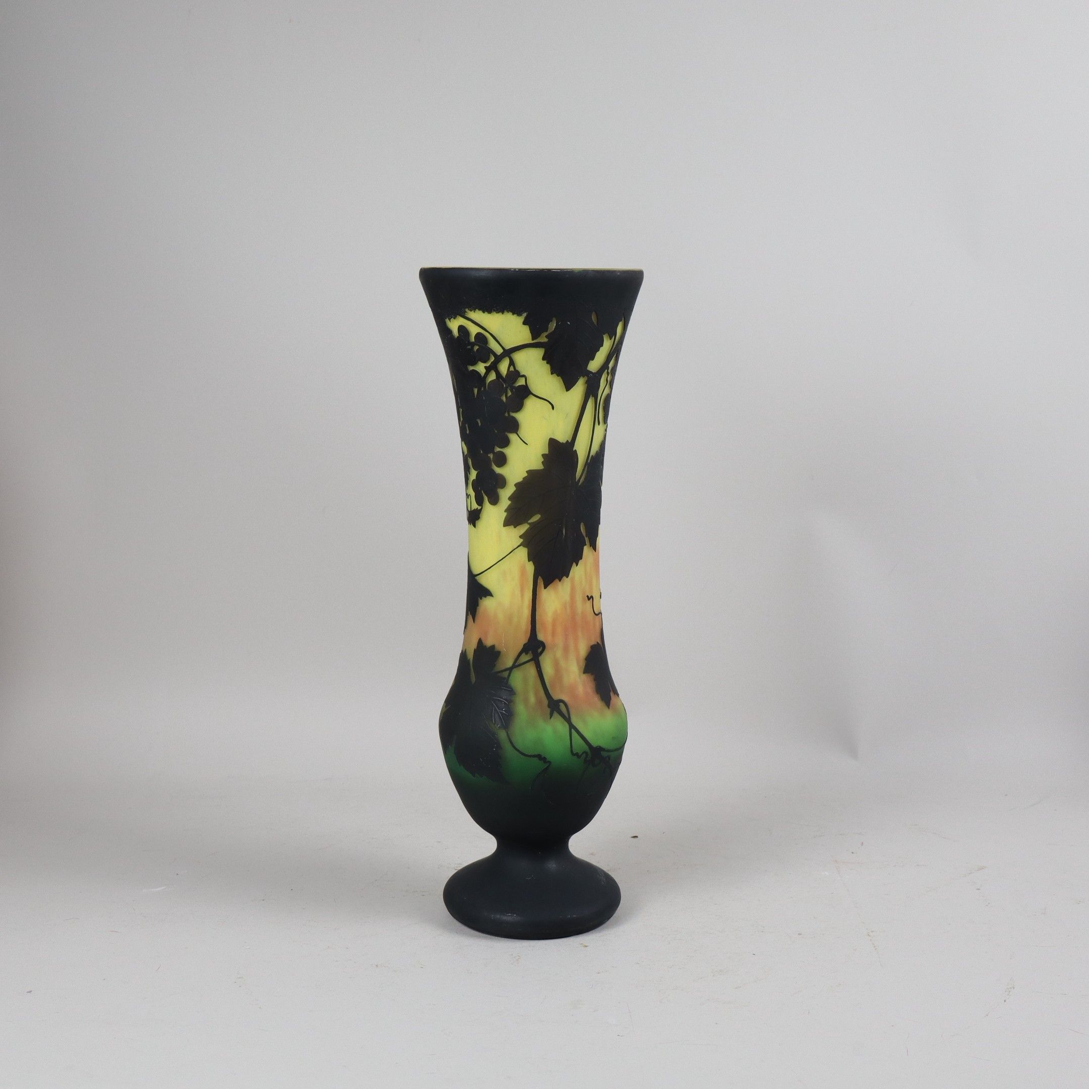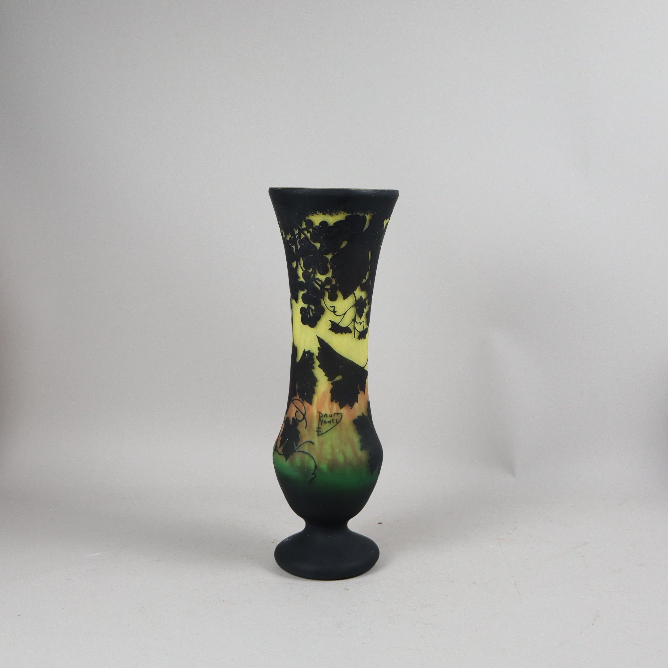DAUM Nancy. Vase balustre sur piédouche en verre multicouche à décor gravé à l’acide de pampres de vigne sur fond marmoréen jaune/orangé/vert. Signé dans le décor. Début XXe. Haut. 37 cm.