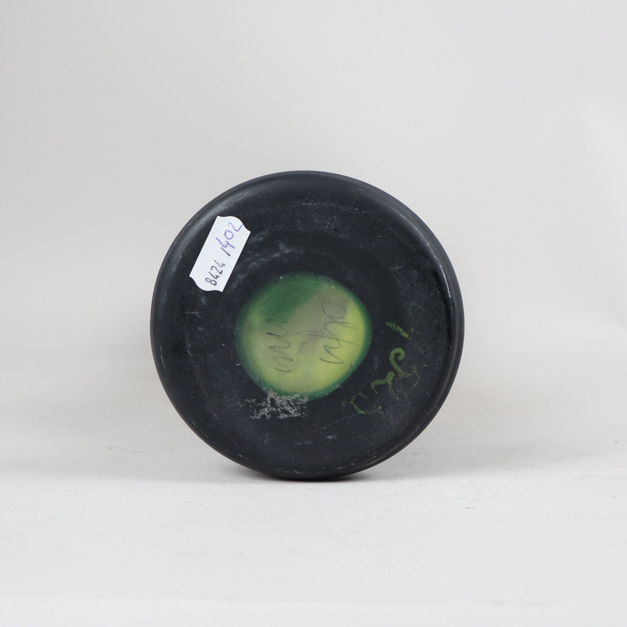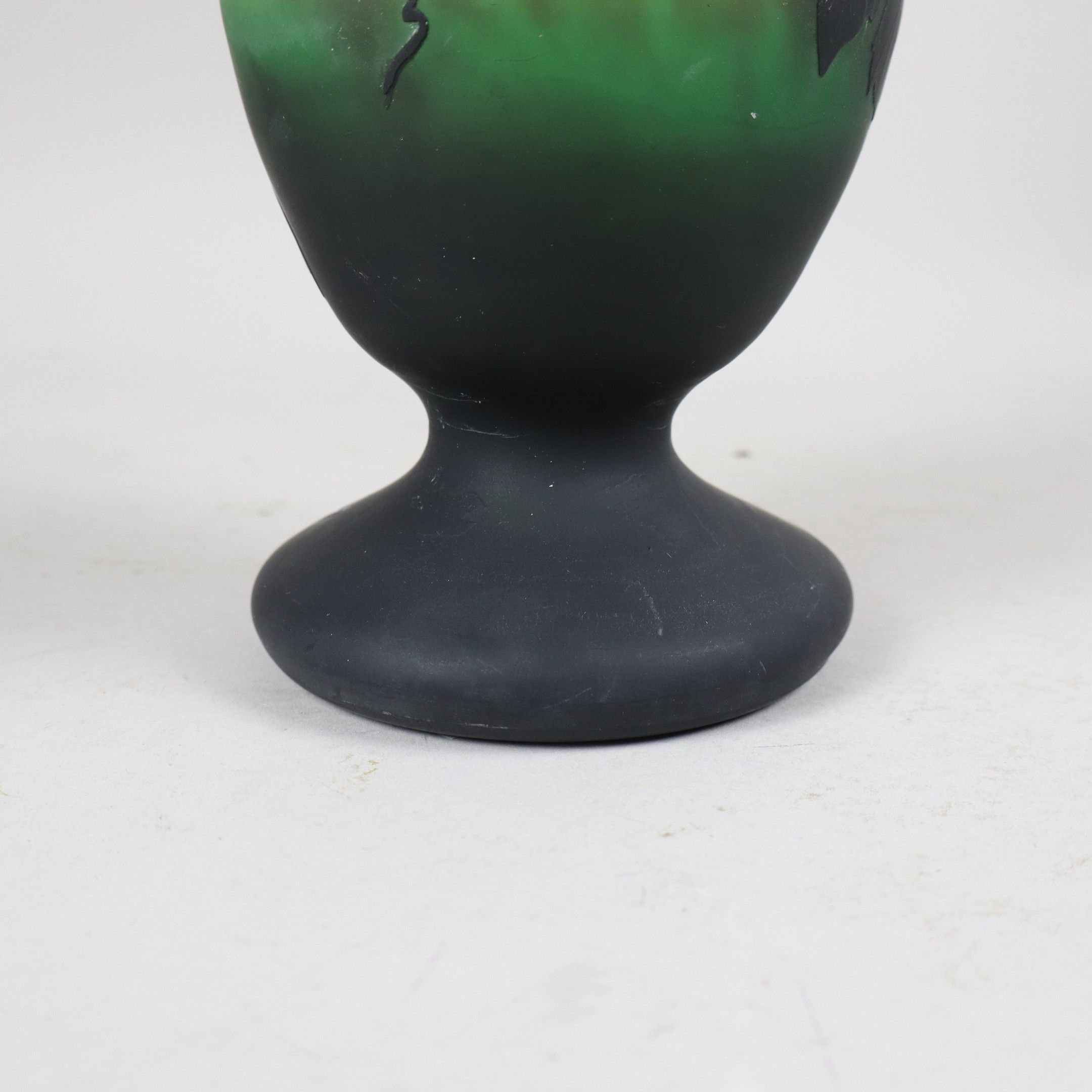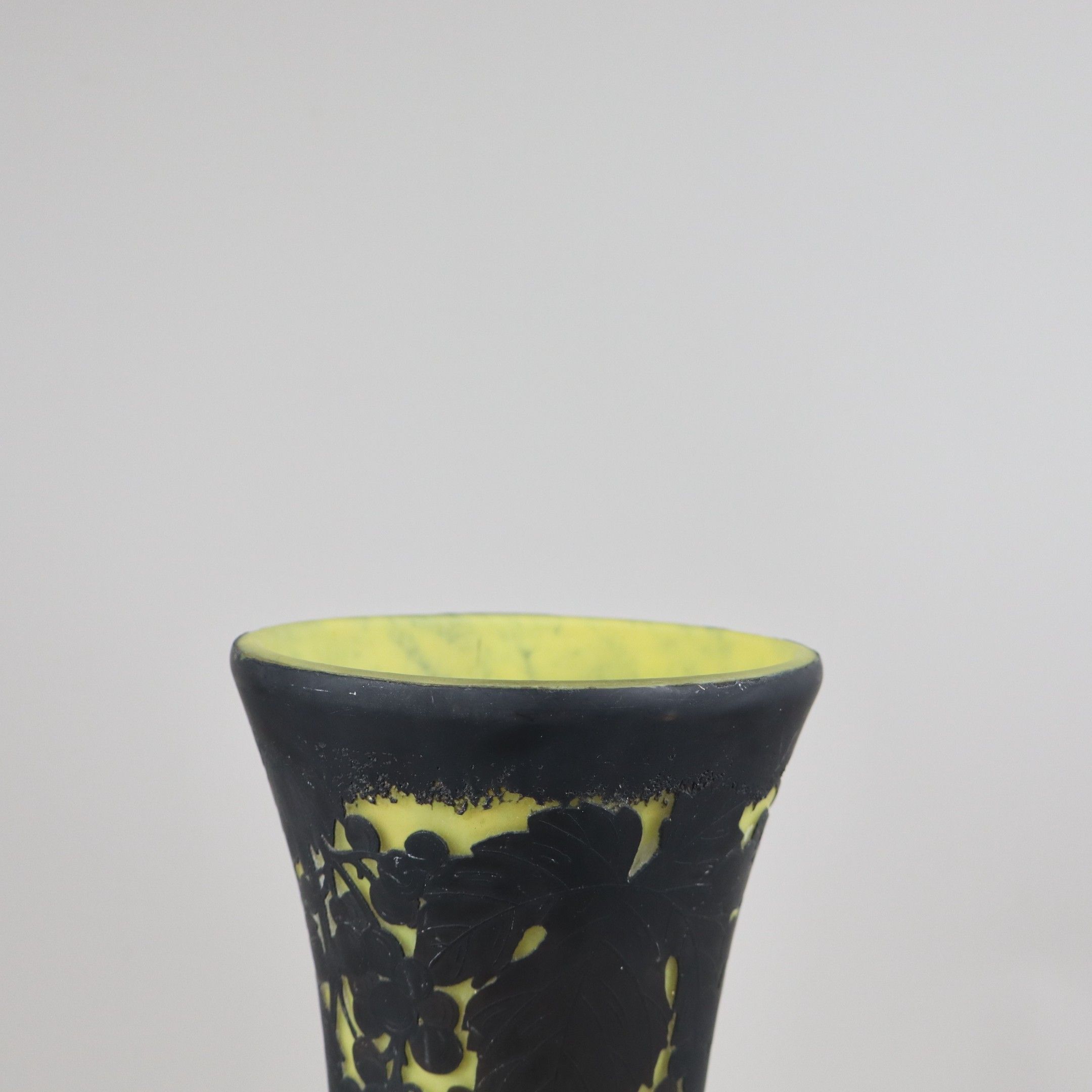 DAUM Nancy. Vase balustre sur piédouche en verre multicouche à décor gravé à l’acide de pampres de vigne sur fond marmoréen jaune/orangé/vert. Signé dans le décor. Début XXe. Haut. 37 cm.