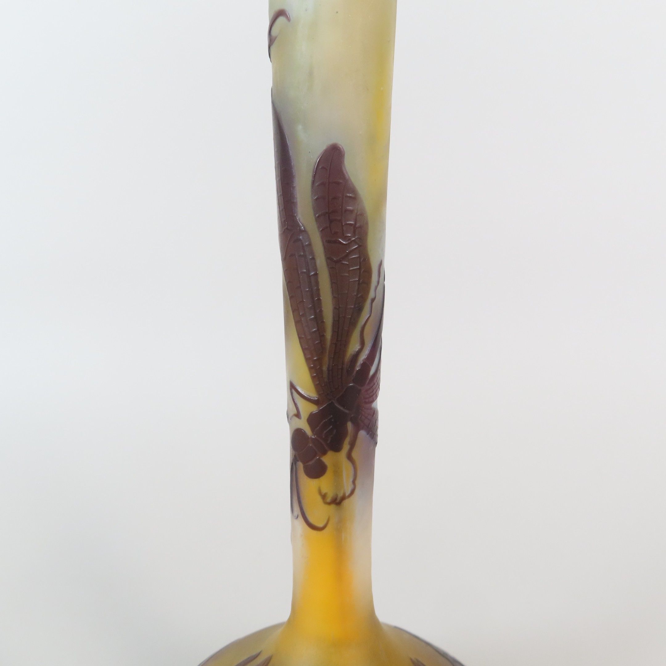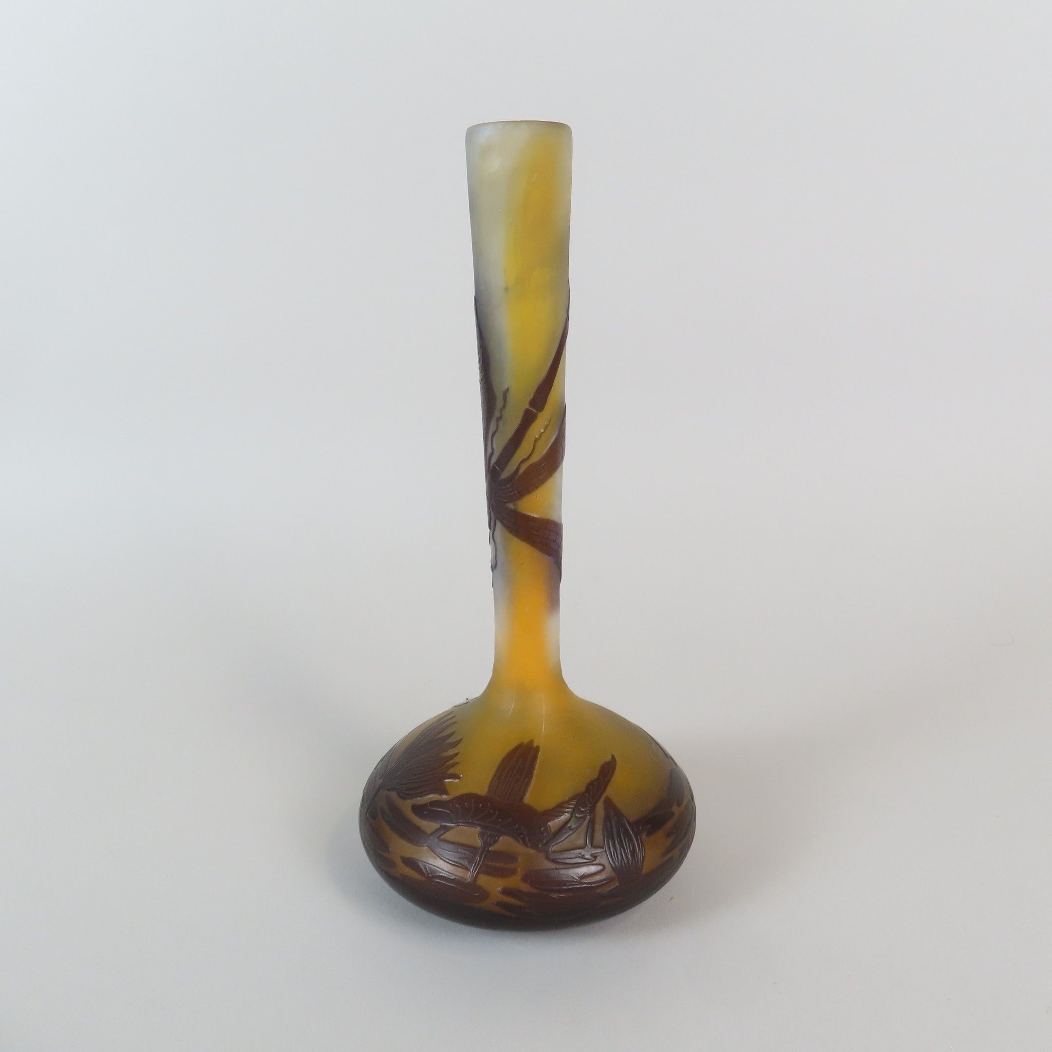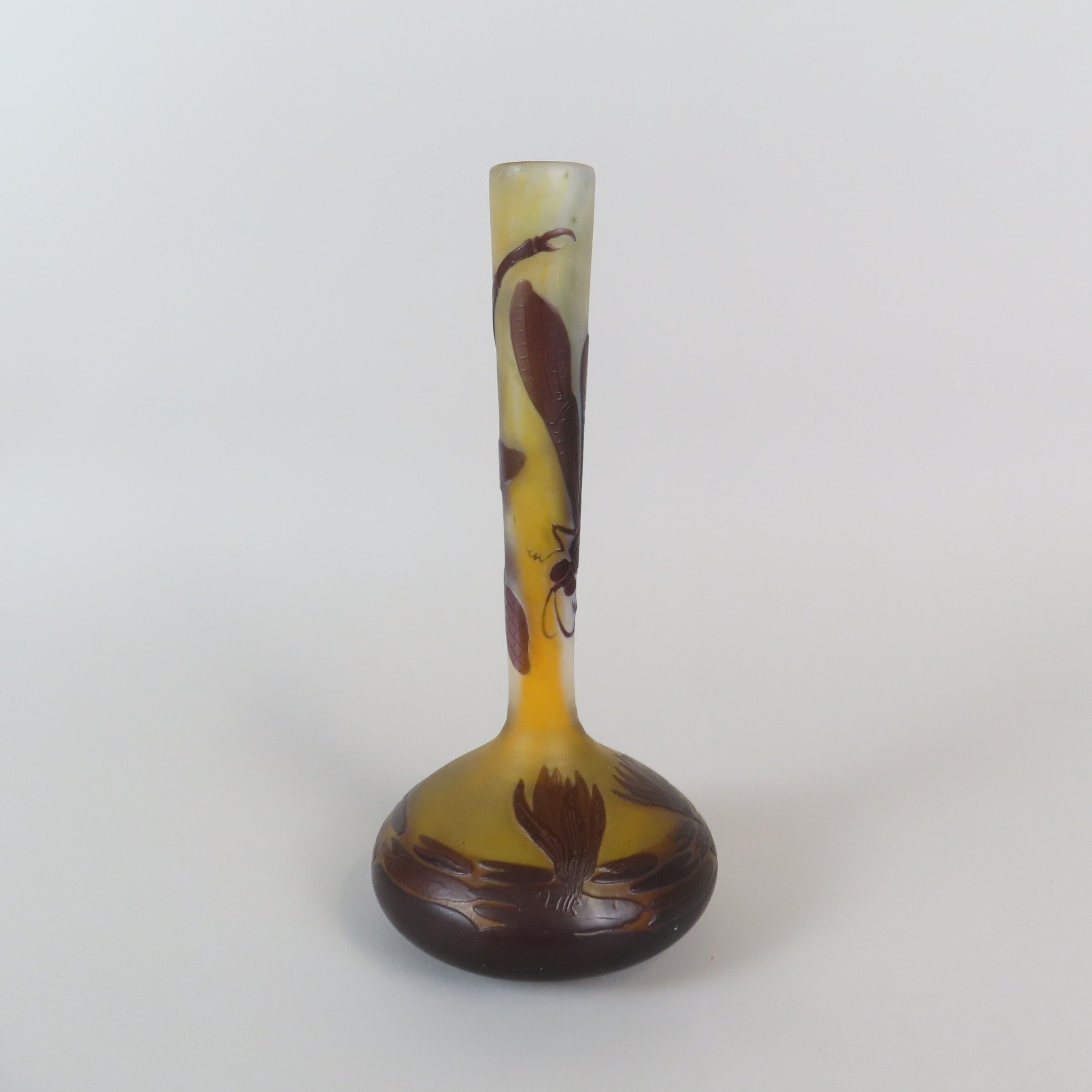 Etablissements GALLE. Vase soliflore en verre multicouche à décor dégagé à l'acide de libellule et de nénuphars. Signé dans le décor. Début XXe. Haut. 21,5 cm.