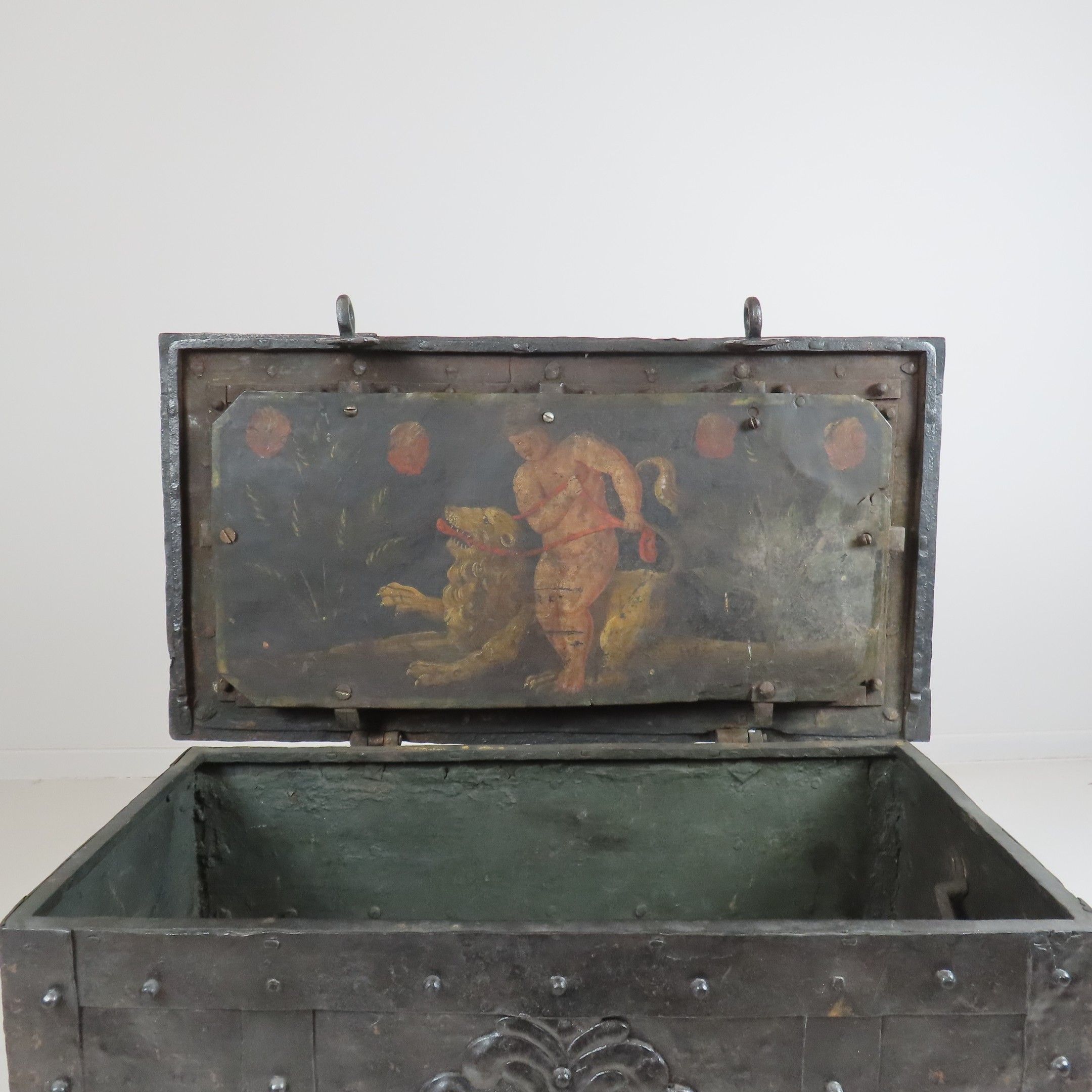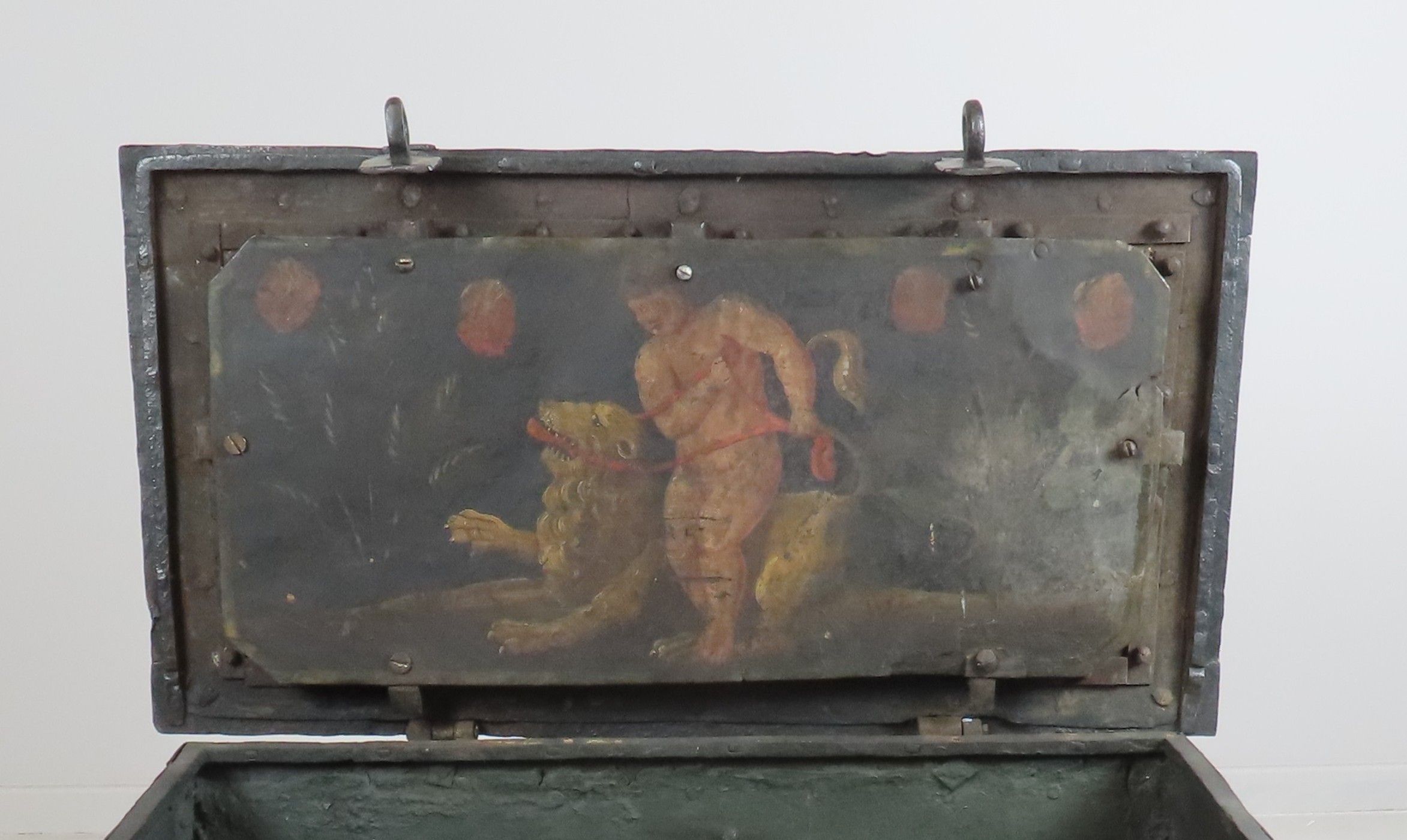 Coffre "de Nüremberg" en fer forgé ; l'intérieur du couvercle à décor d’une scène peinte figurant Hercule et le Lion de Némée. XVIIIe. Haut. 34 cm. ; Long. 75 cm. ; P. 44 cm. (usures)