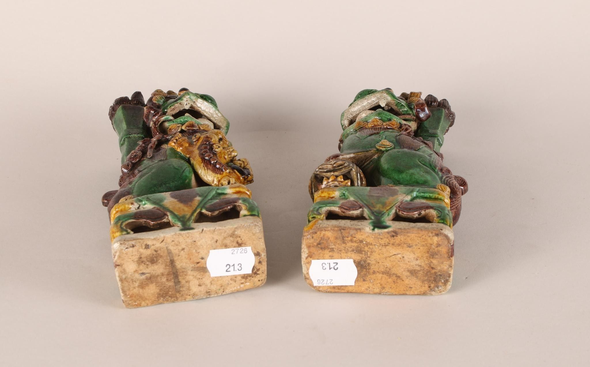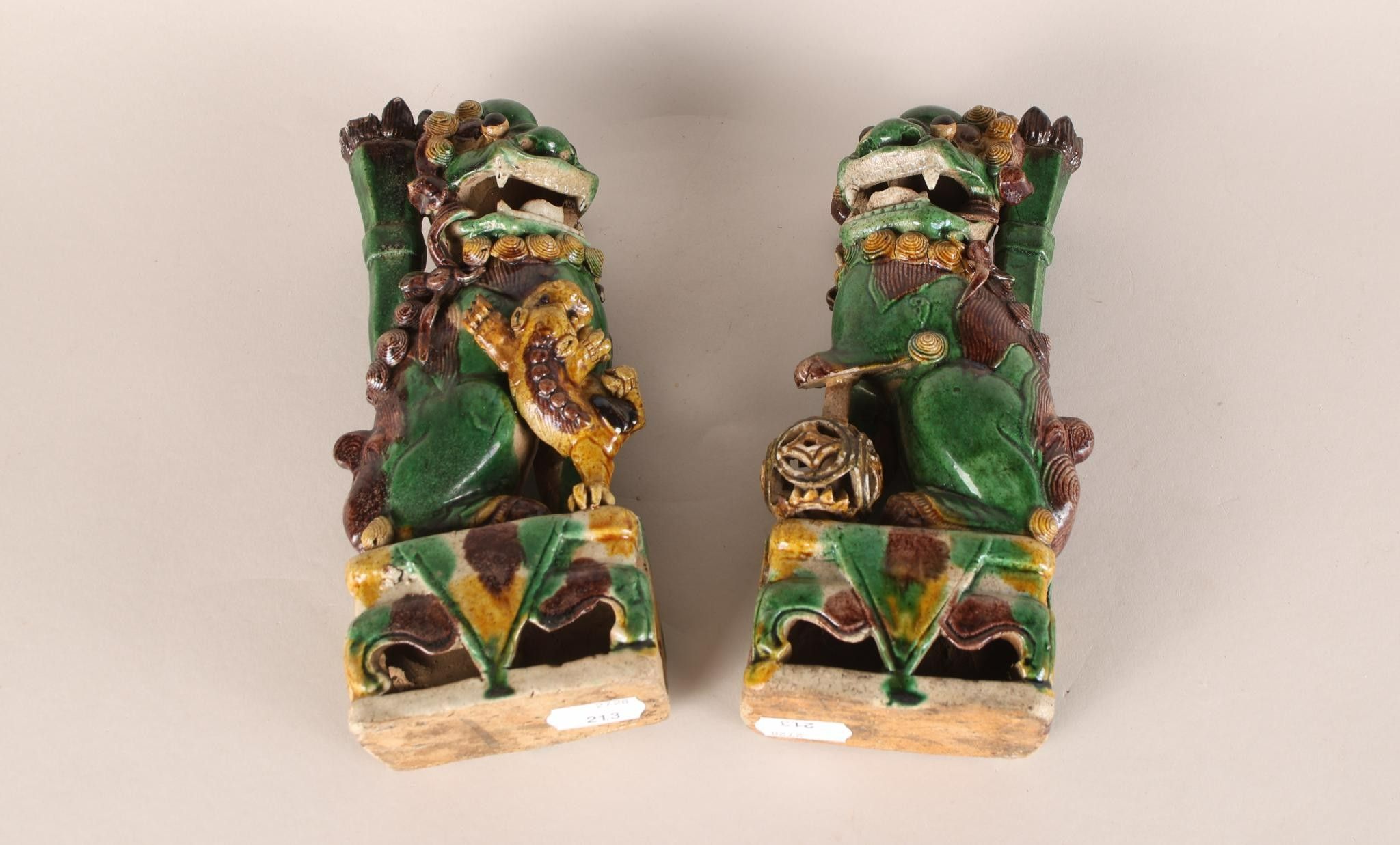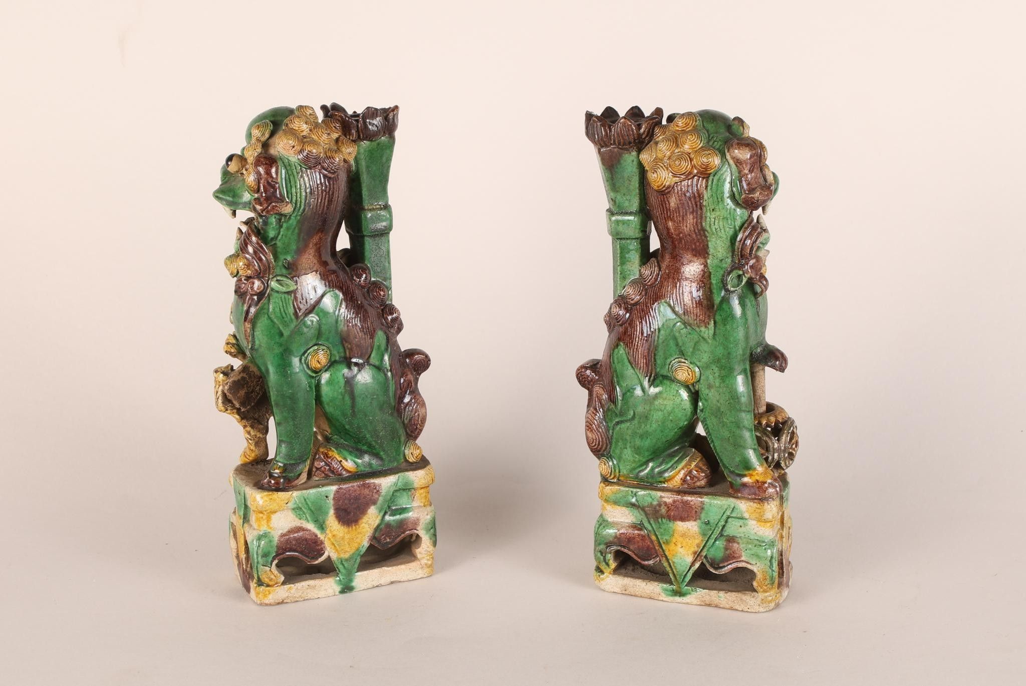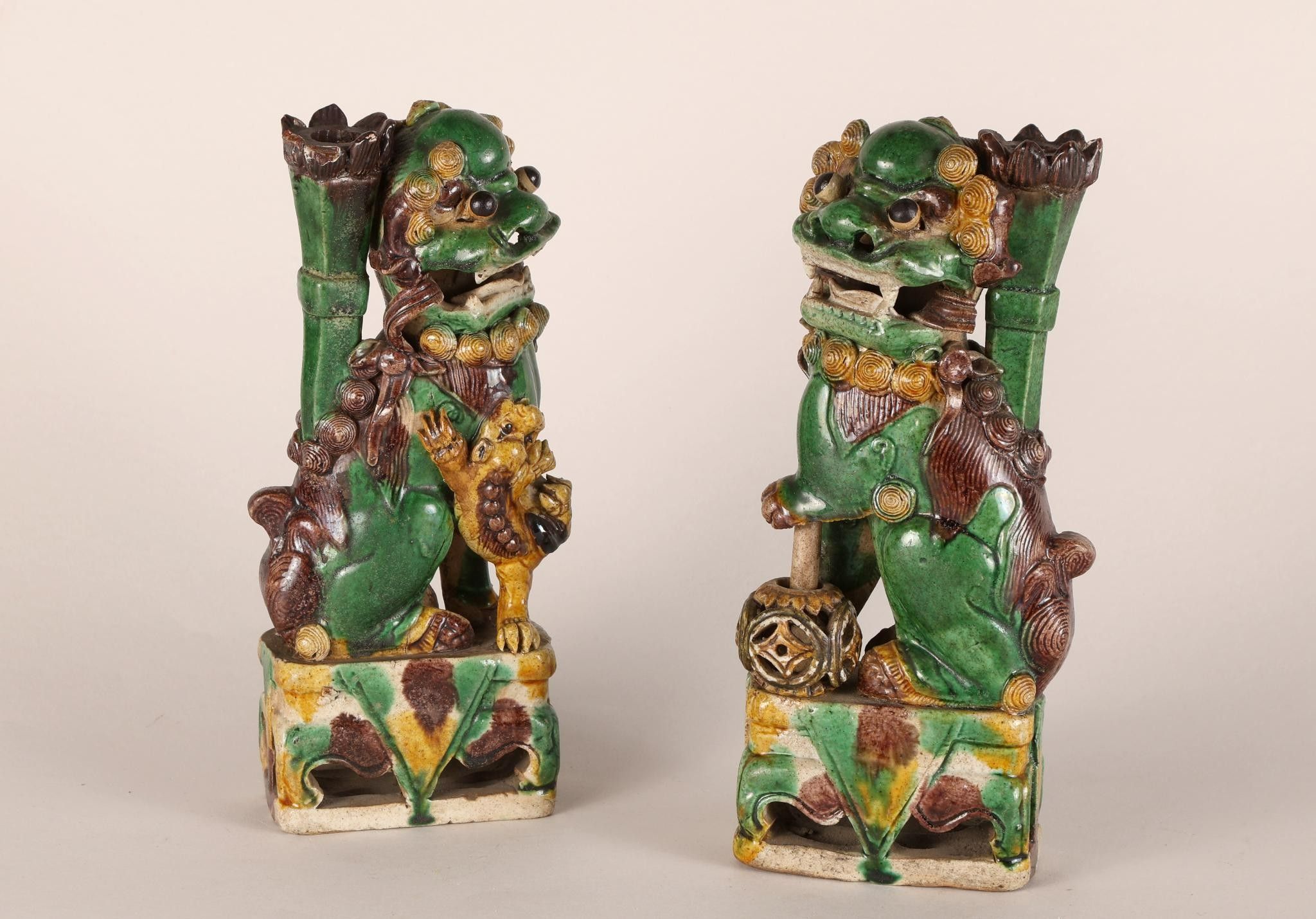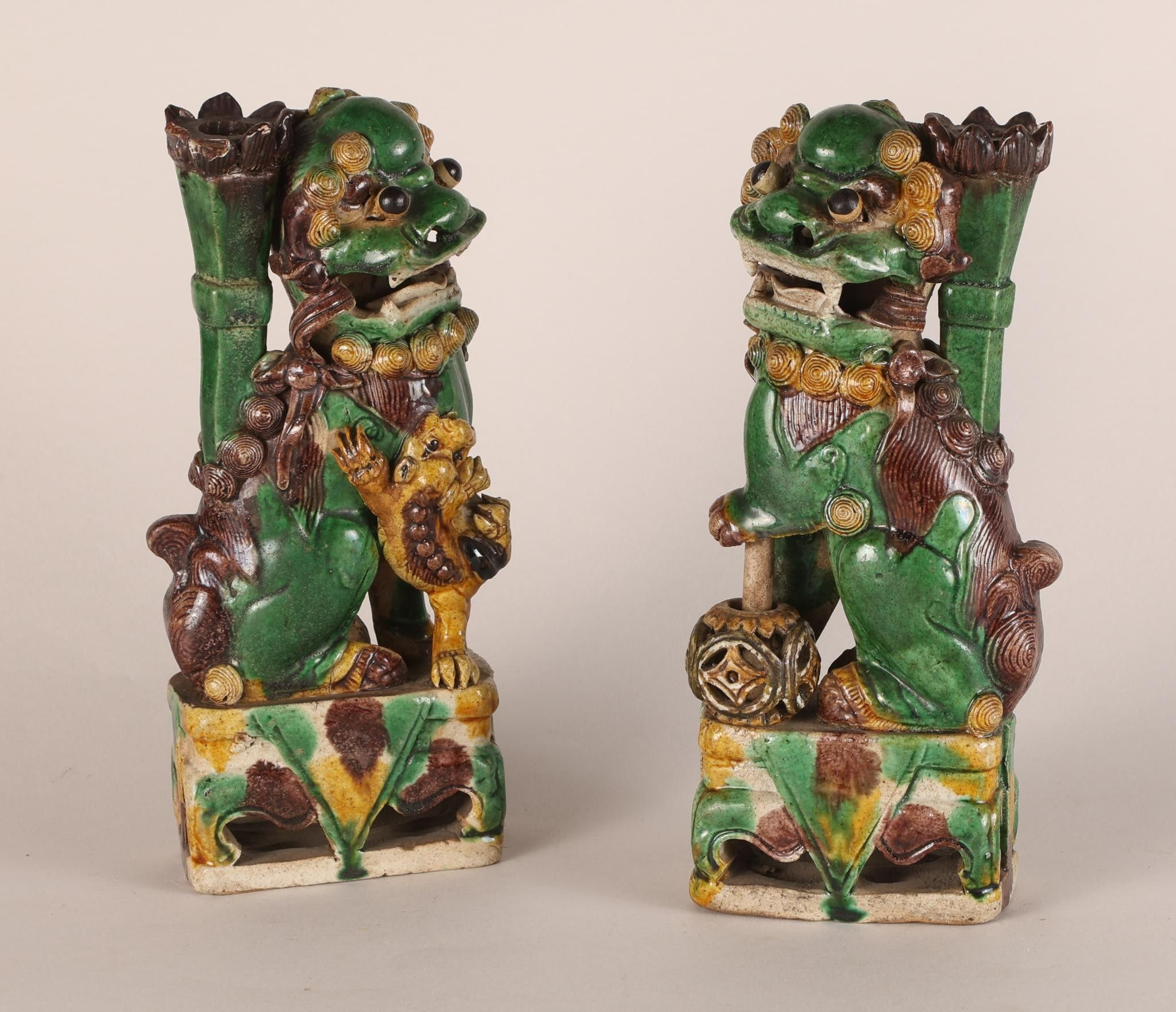 Couple de chiens de Fô porte-baguettes, en biscuit émaillé sancai, trois couleurs, figurés assis sur des terrasses, la femelle avec son petit, le mâle avec une balle.