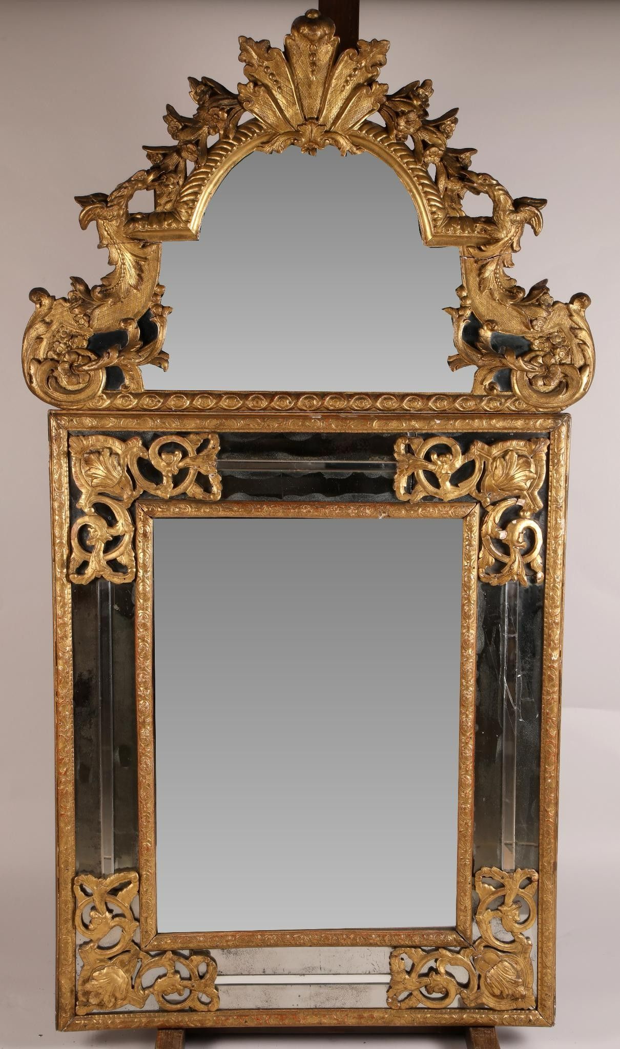 Important miroir à fronton et parcloses, en bois sculpté et doré, à décor de coquille et guirlandes de fleurs.