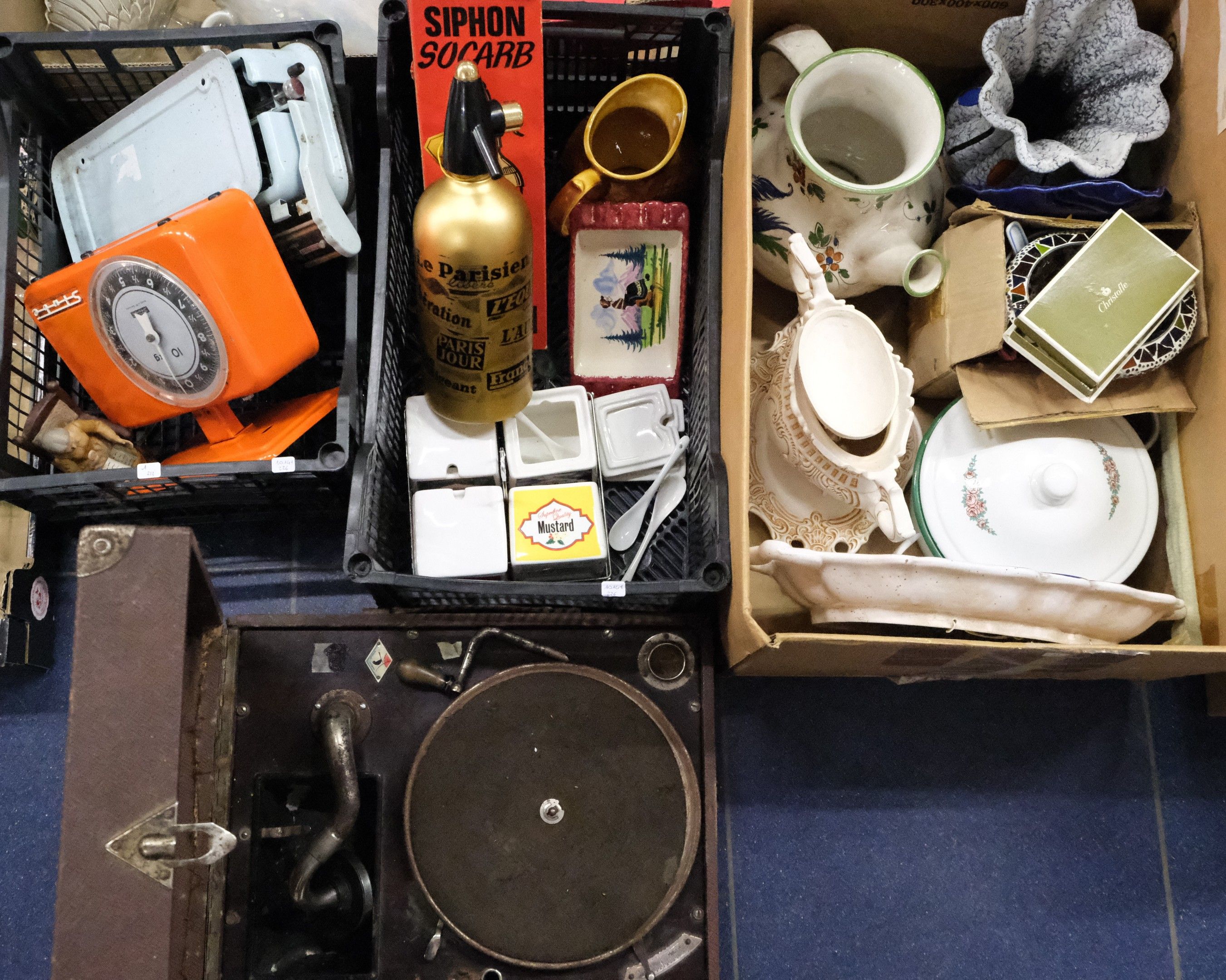 Lot de vaisselle dépareillée, gramophone (en l'état), cruches et divers (trois cartons).