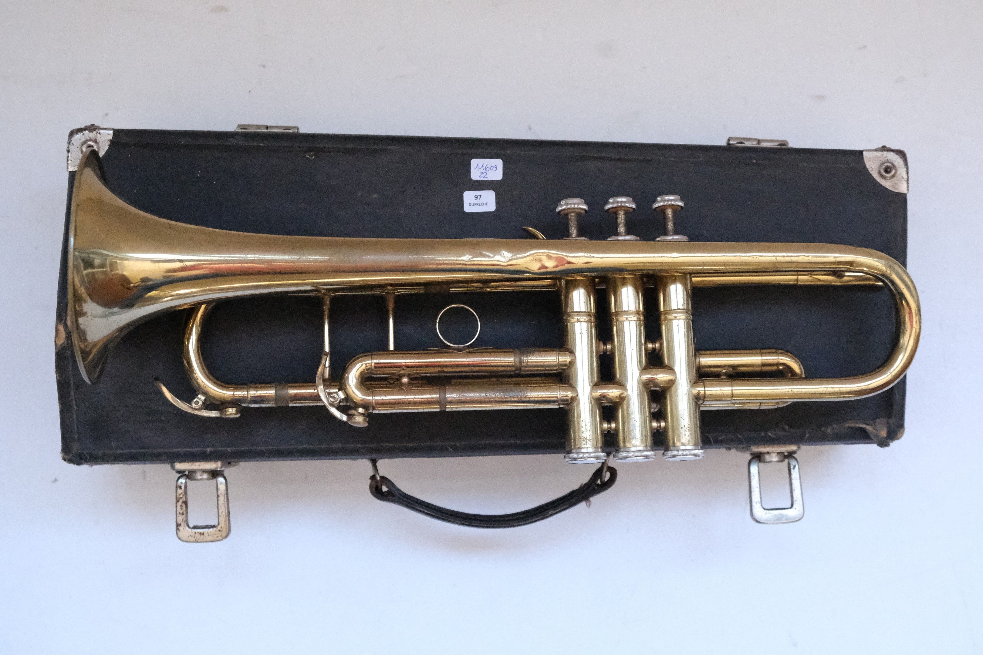 Trompette ROYAL ARTIST avec embouchure et coffret (enfoncements). Notée 2184. Long. 45.