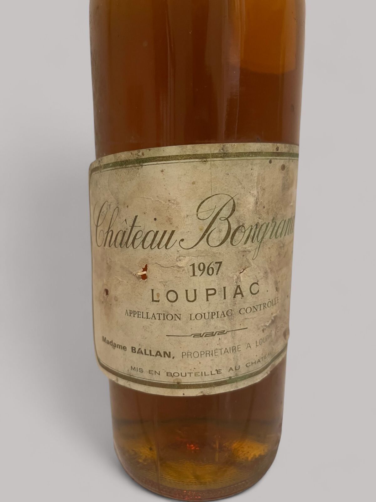 1 bouteille CHÂTEAU BONGRAND 1967 Loupiac (Niveau mi épaule, étiquette décollée, abîmée et marquée.) Expert : Louise-Adélaïde SAINDERICHIN