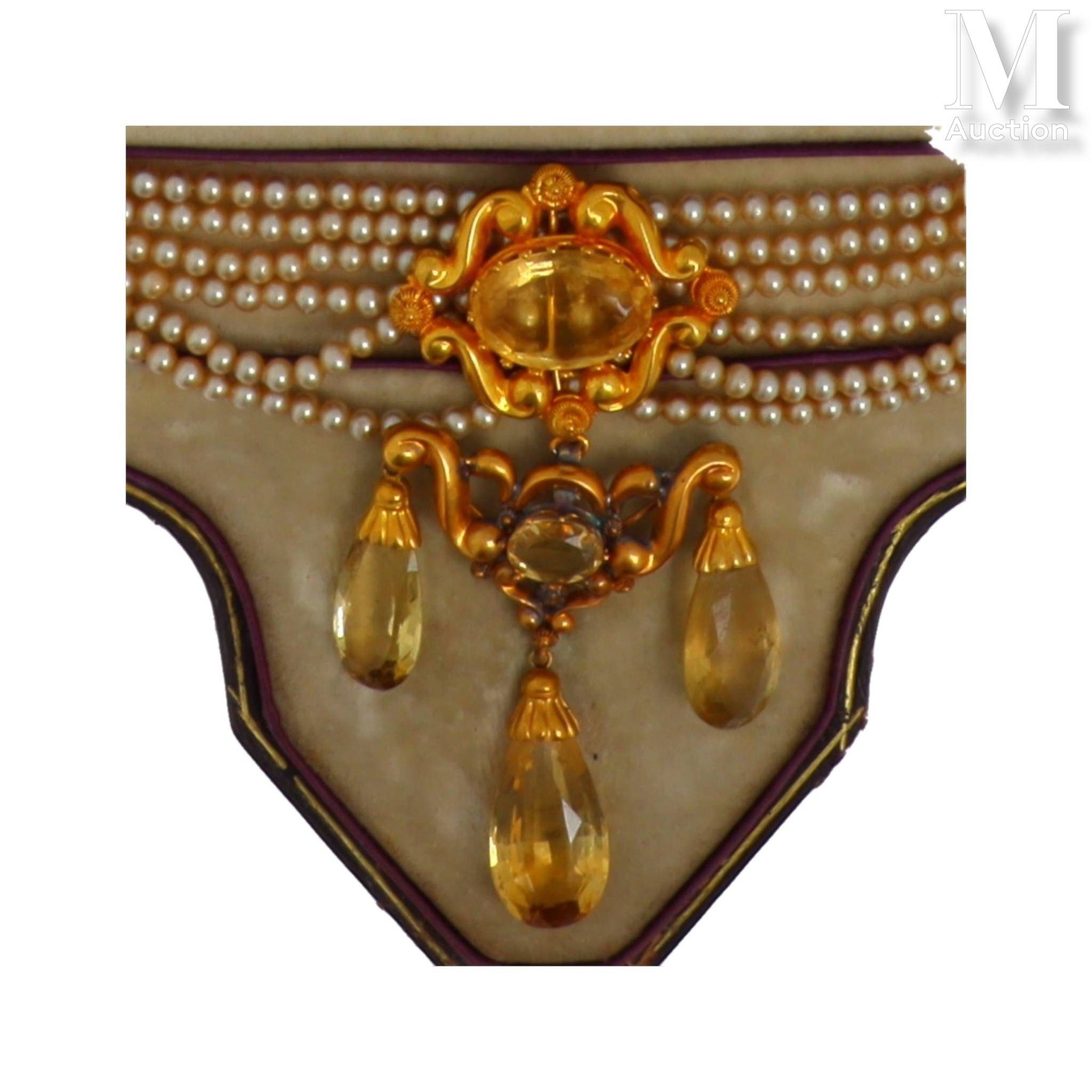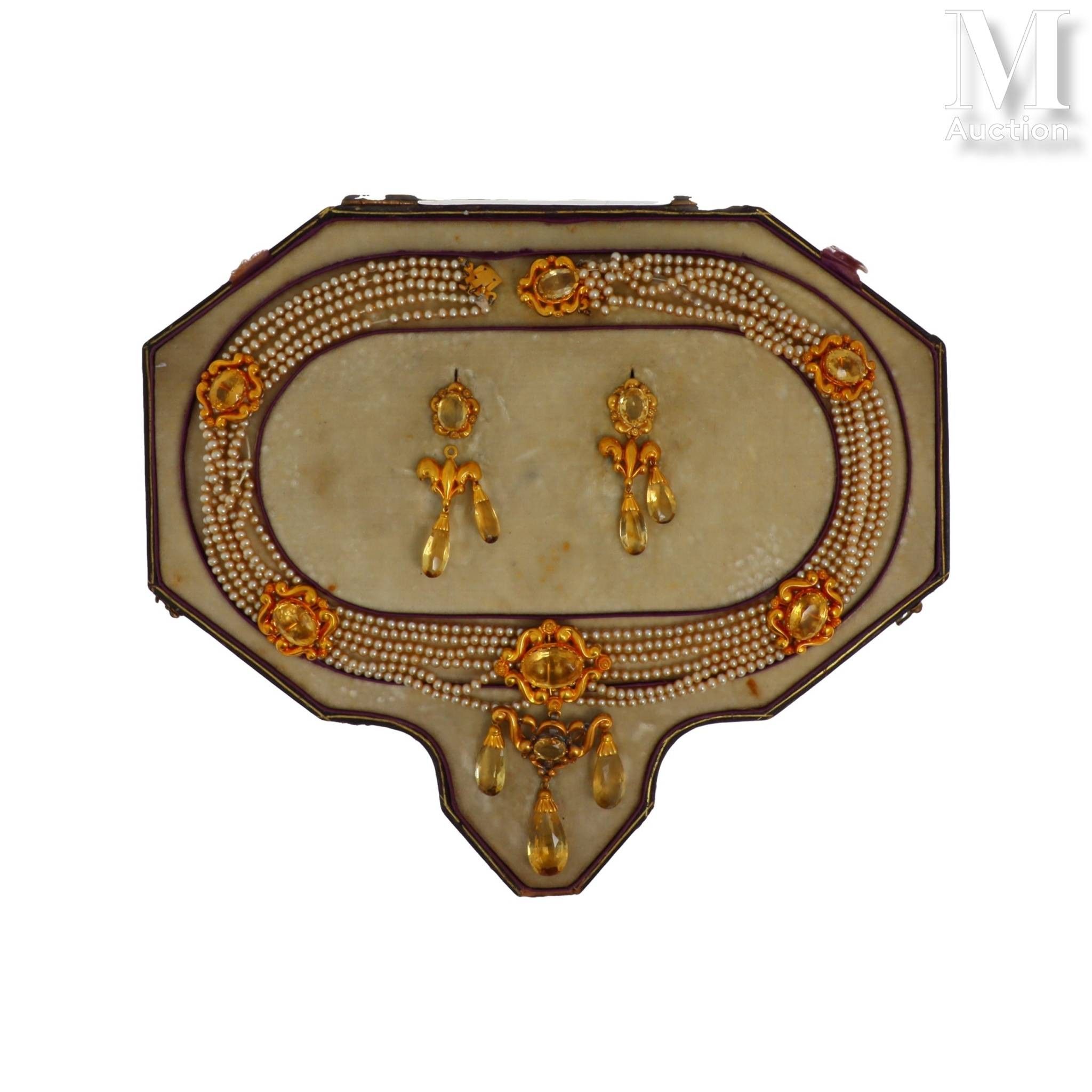 Demi parure en or jaune 18K (750°/°°) comprenant un collier et une paire de pendants d'oreilles; le collier orné de cinq rangs de perles fantaisies alternés d'éléments en or jaune formant des volutes centrées d'une citrine ovale, l'élément centrale retenant trois citrines en pampilles, fermoir à lame cliquet; et la paire de pendants d'oreilles ornée de citrines en pampilles soulignées d'or ciselé. Travail français de la première moitié du XIXème siècle.