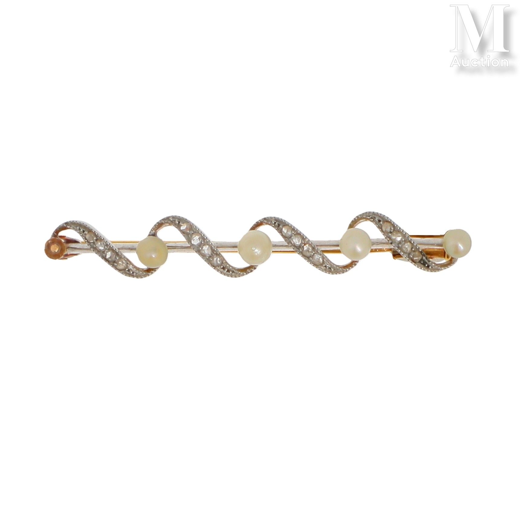 Broche barrette en or jaune et gris 18K (750°/°°) ornée de quatre perles* alternées d'un motif en spiral serti de petits éclats de diamants.