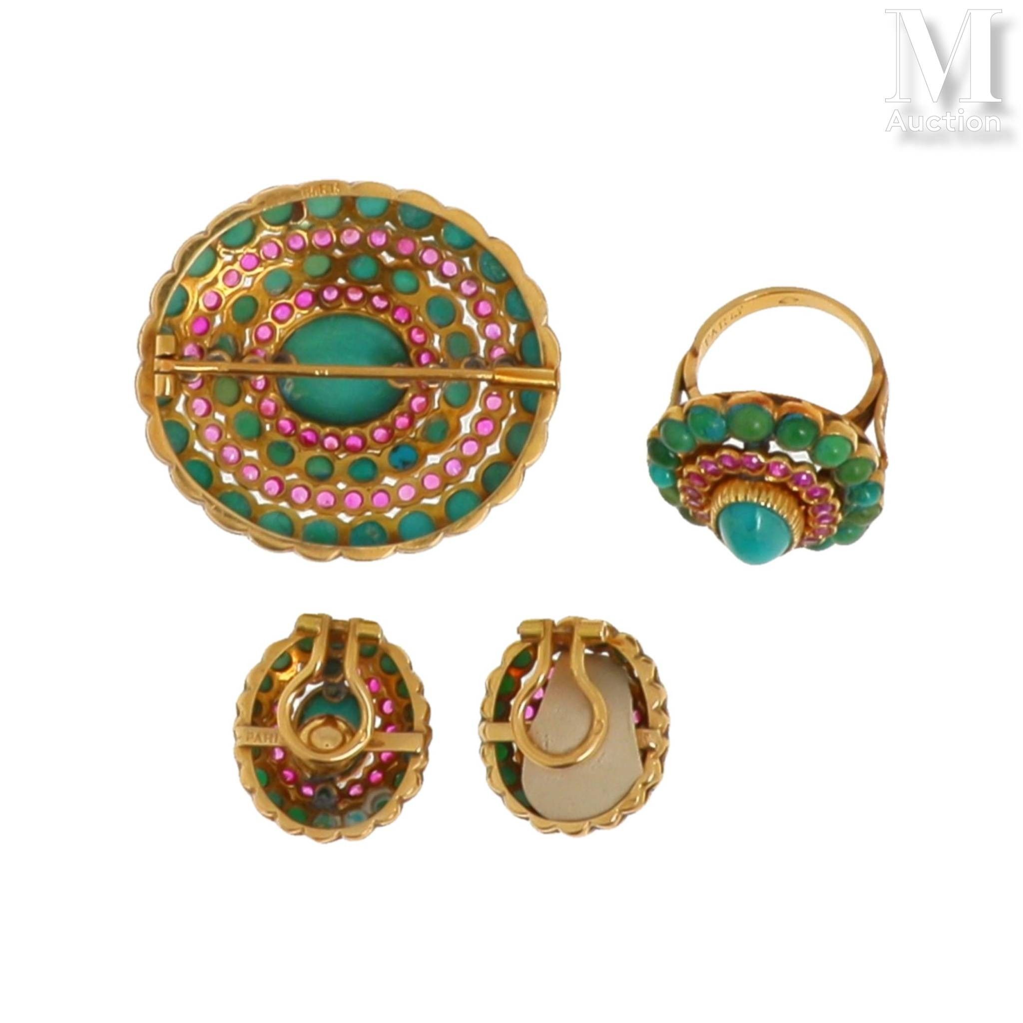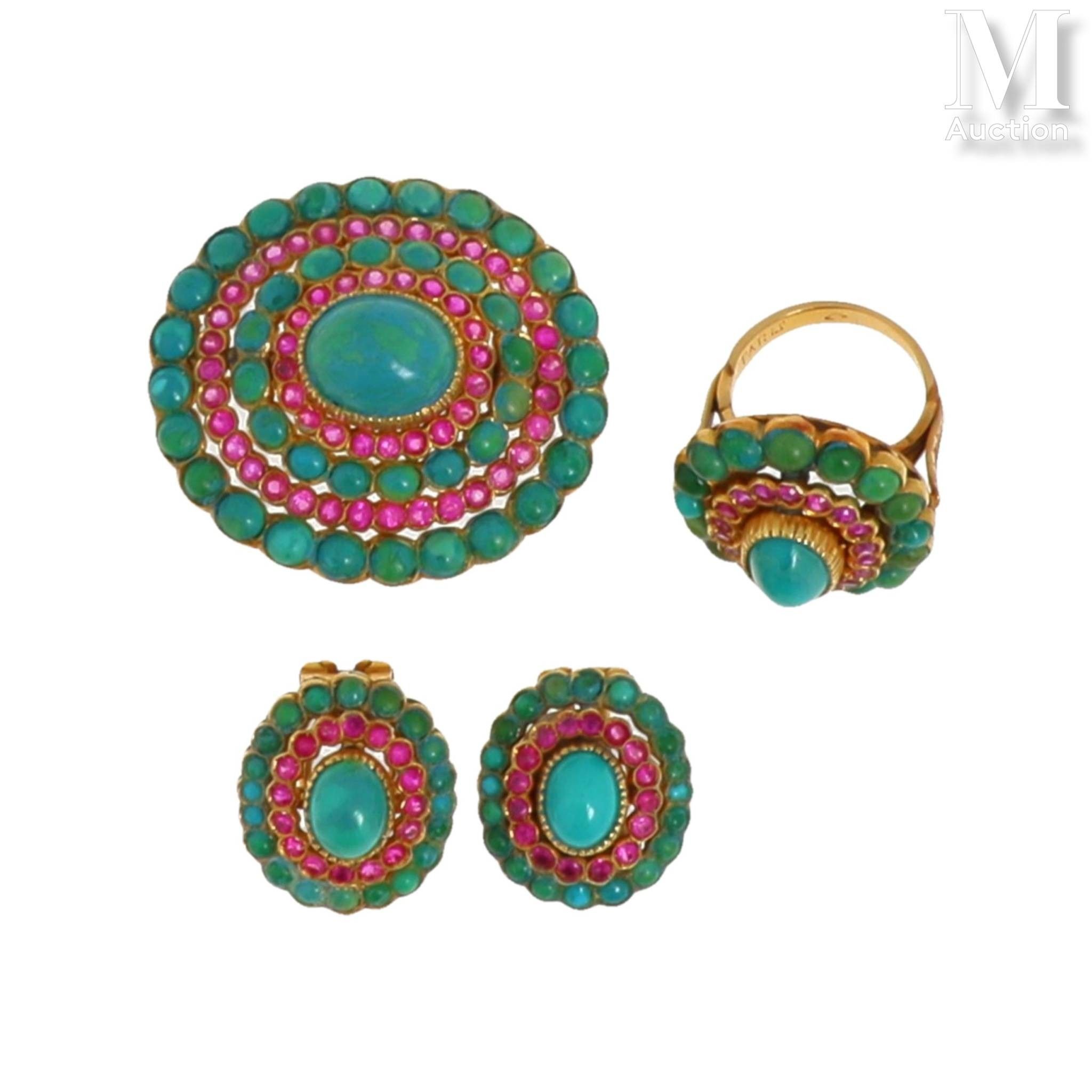 Parure en or jaune 18K (750°/°°) comprenant une bague, une broche et une paire de clips d'oreilles, chacun orné de cabochons de turquoises mortes et de rubis synthétiques ronds facettés.