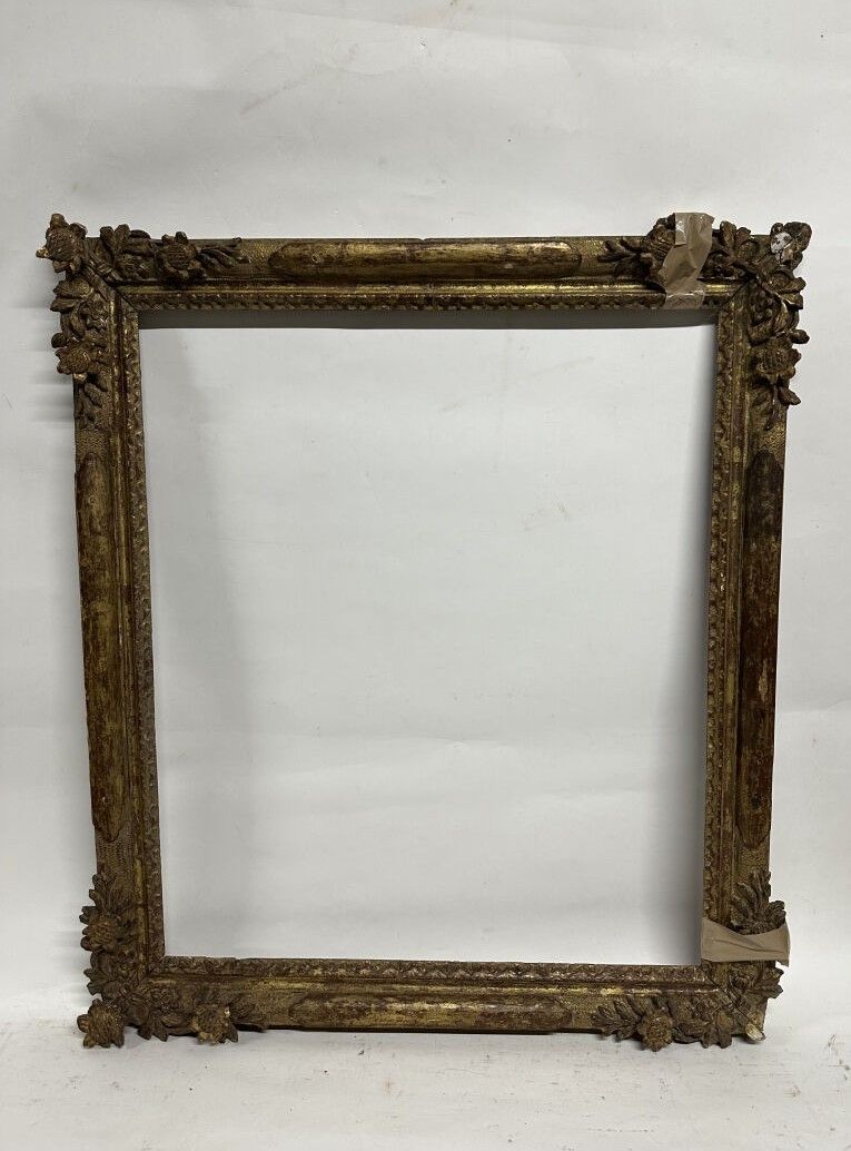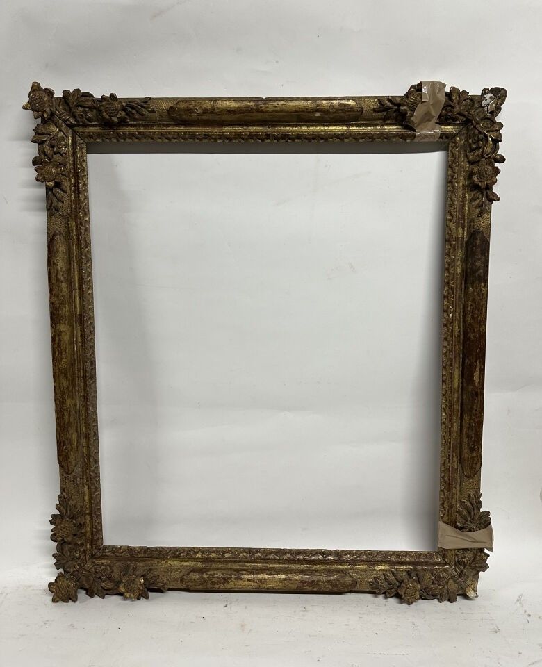 Cadre en sapin sculpté et doré à décor à coins à fleurs Provence - Époque fin Louis XIII-Début Louis XIV 60 x 71 x 8 cm (accidents)