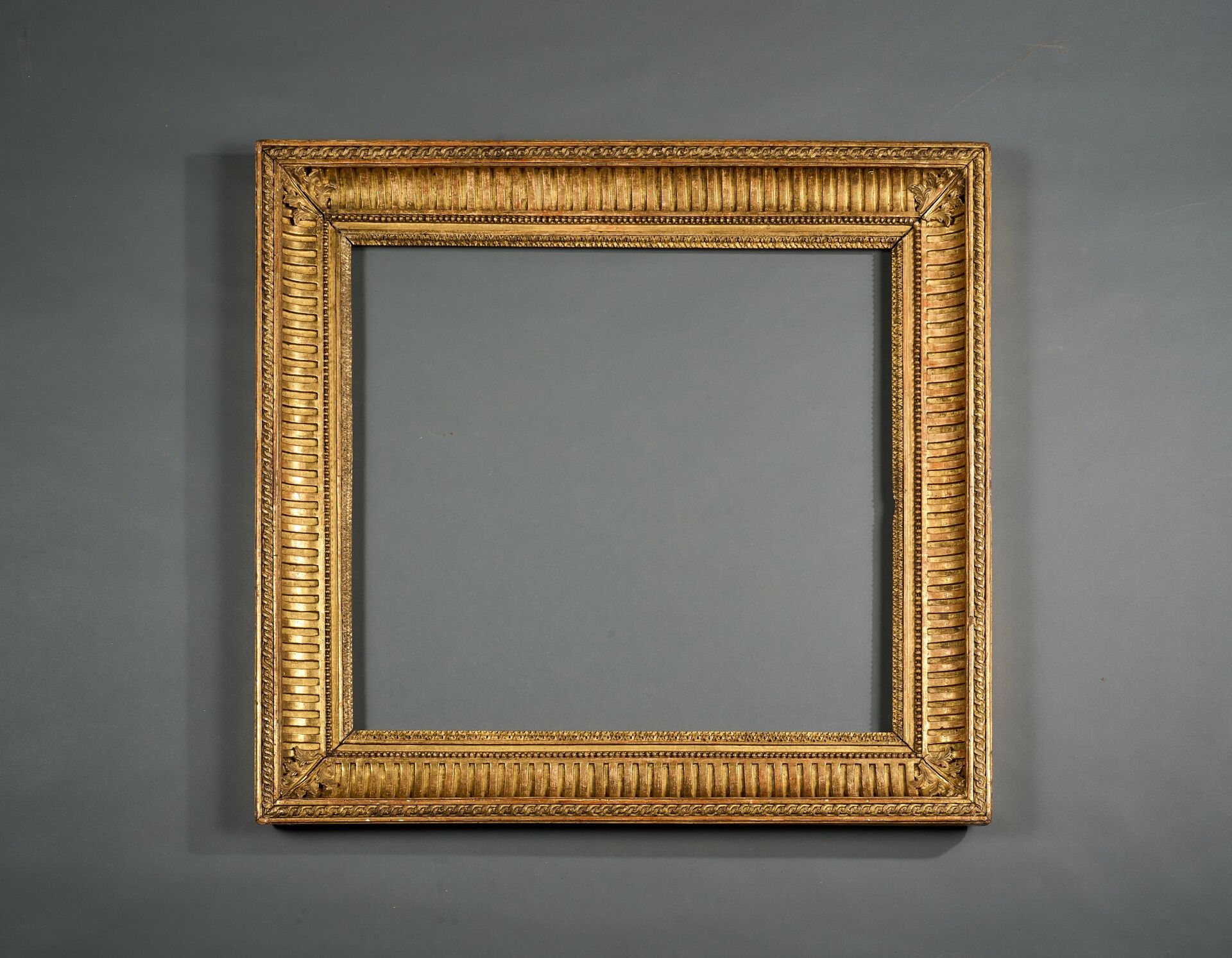 Cadre en bois sculpté et doré dit à canaux à décor de rais de perles, canaux et frise de piastres