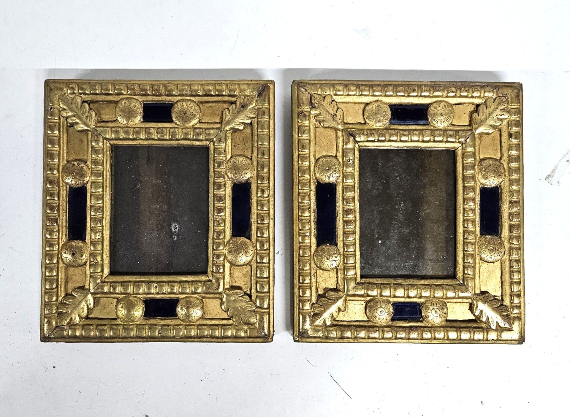 Paire de petits miroirs en bois sculpté et redoré à décor de réserves de verre bleu