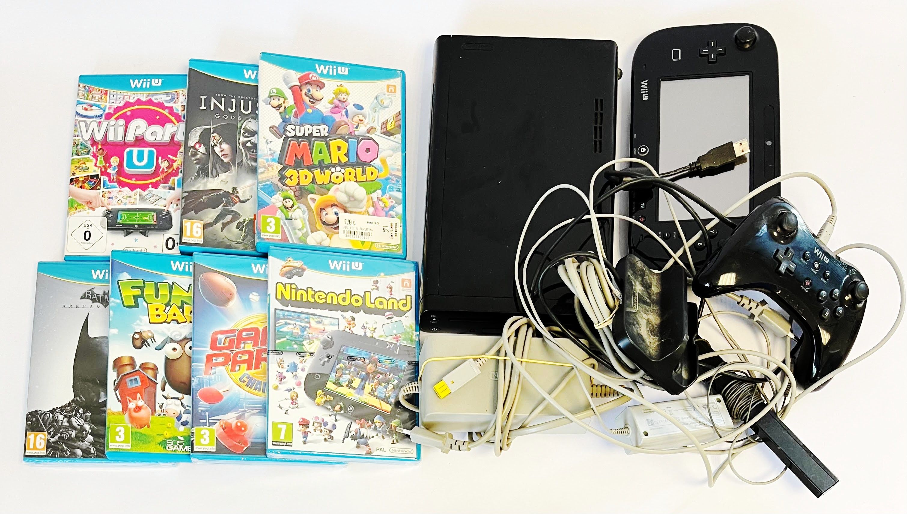 NINTENDO Console Wii U avec accessoires et 7 jeux : Injustice , Super mario 3D world, Mario kart 8, Wii party et divers. Non garanti. Non testé