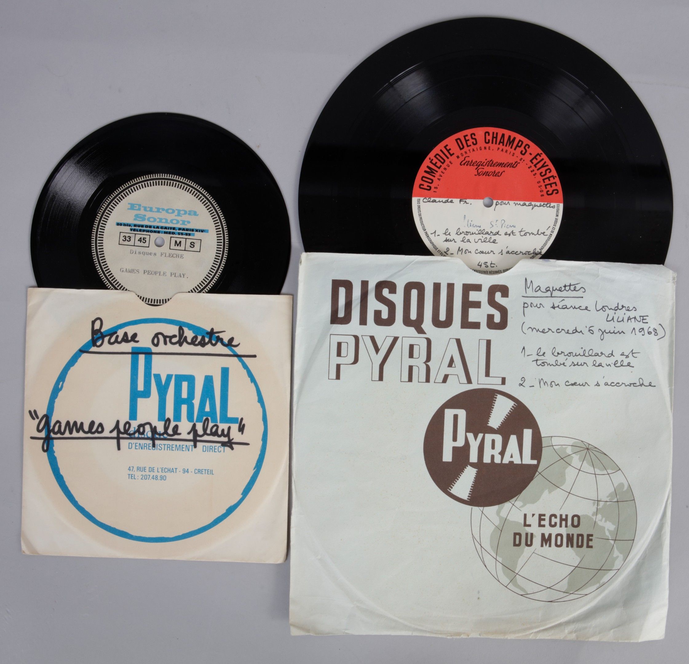 CLAUDE FRANCOIS : Un disque acetate 45 tours sur lequel le chanteur interprète 2 titres : « Le brouillard est tombé sur la ville » et « Mon cœur s’accroche ». Deux chansons destinées à Liliane Saint-Pierre, artiste des Disques Flèche. Une séance en studio d’enregistrement programmée à Londres le mercredi 6 juin 1968. Ce disque unique permettait à Liliane de répéter avant l’enregistrement. Un document inédit. On y joint, 1 acetate 45 tours de la base orchestre du titre « Jeux dangereux » adapté du succès « Game people play ». Instrumental uniquement sur les deux faces du vinyle.