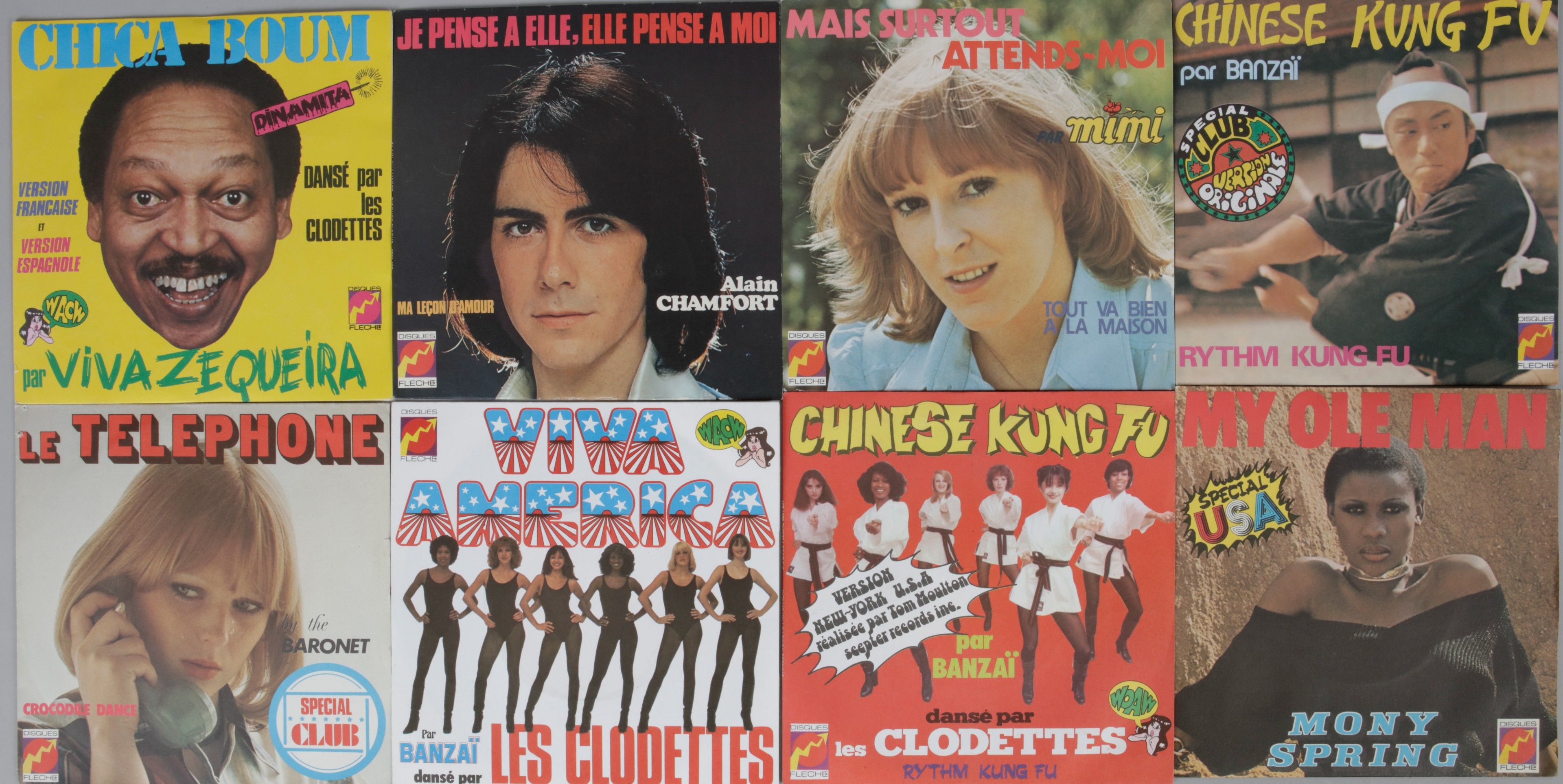 CLAUDE FRANCOIS / DISQUES FLECHE : Un ensemble de 8 disques originaux 45 tours vinyle publiés entre 1973 et 1976 aux Disques Flèche, des titres interprétés par Alain Chamfort, Viva Zequeira, Mony Spring, Banzaï, Les Clodettes, Mimi et The Baronet. Très bel état.