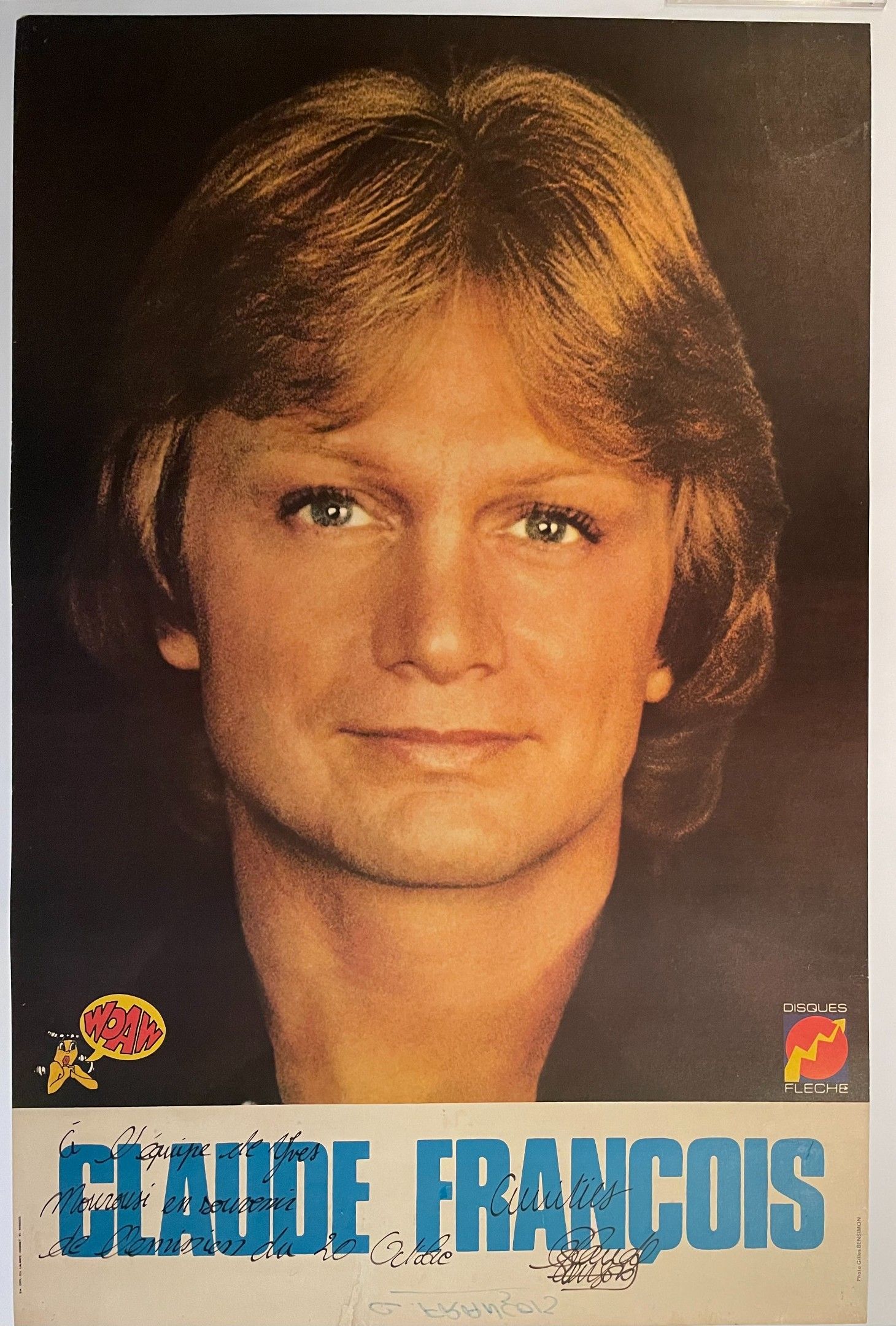 CLAUDE FRANCOIS : Une affiche originale dédicacée par l’artiste à l’issue d’une émission en direct de 15h30 à 19h sur RMC, le 20 octobre 1976 et présentée par Yves Mourousi : « A l’équipe de Yves Mourousi en souvenir de l’émission du 20 octobre. Amitiés Claude François ». Une affiche qui restera longtemps au mur du bureau de production dans les locaux de la radio situés rue Magellan à Paris. Affiche entoilée.