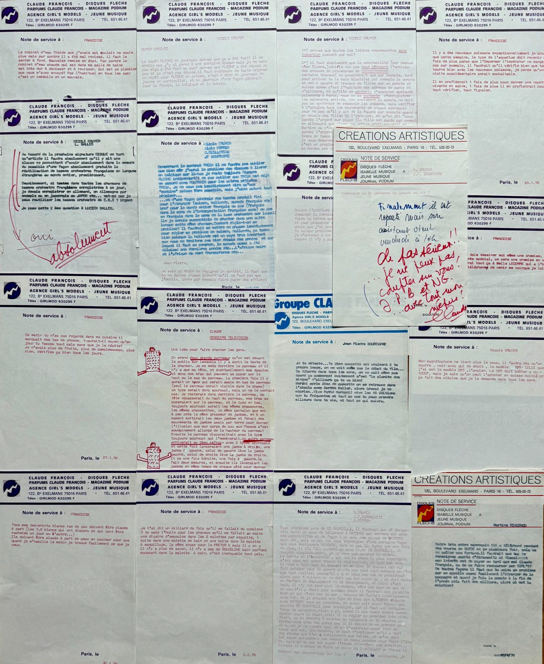CLAUDE FRANCOIS / GROUPE CLAUDE FRANCOIS : Un ensemble de 17 notes de service originales, dictées par le chanteur entre janvier et mars 1978. Répondant à une question ou analysant une situation, sur trois notes figurent quelques mots et dessins manuscrits de Cloclo. Documents rares qui indiquent les dernières préoccupations de l’artiste quelques semaines et quelques heures avant de disparaitre. Bel état.