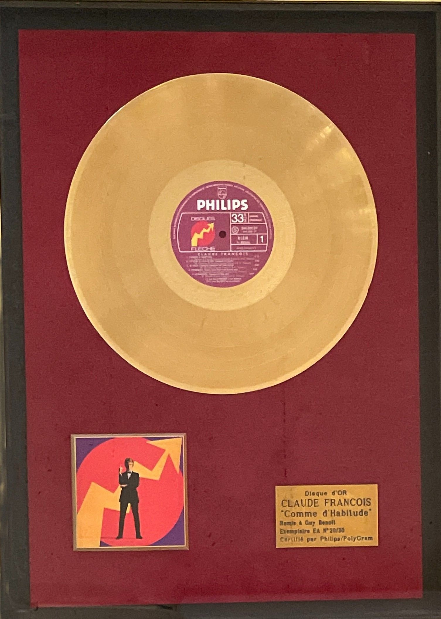 CLAUDE FRANCOIS : Un disque d’or de l’album « Comme d’Habitude » pour plus de 500.000 exemplaires vendus en 1967/1968. Réédition par Philips/PolyGram en 1994 et remis à Guy Benoit. Epreuve d’Artiste (EA) N°20/30 exemplaires fabriqués. PolyGram Merchandising. En l’état