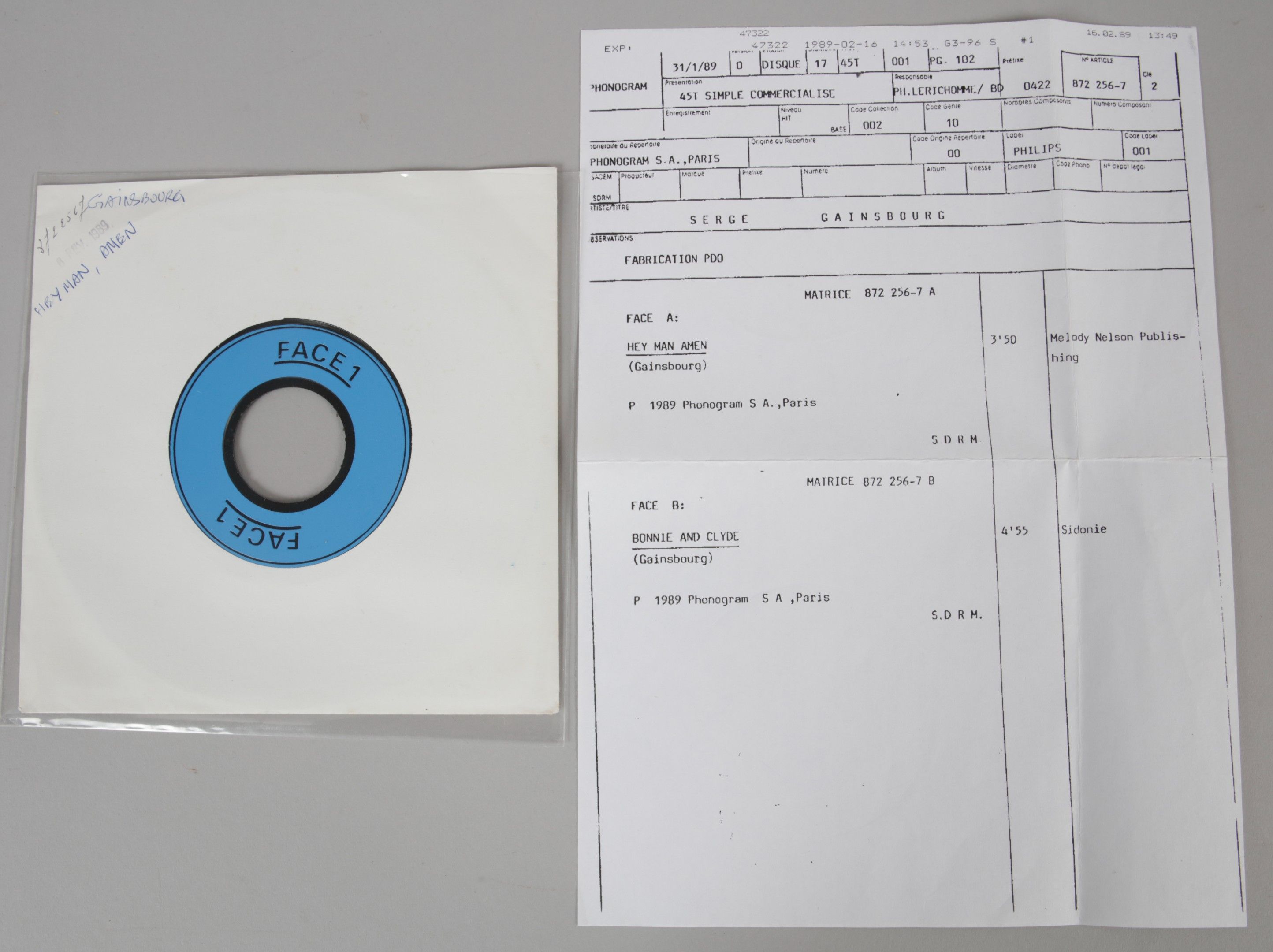 SERGE GAINSBOURG : Un disque test-pressing original 45 tours vinyle de « Hey man, Amen » et « Bonnie & Clyde », publié en février 1989 chez Phonogram et adressé à l’artiste pour une première écoute avant publication du disque. Bel état.