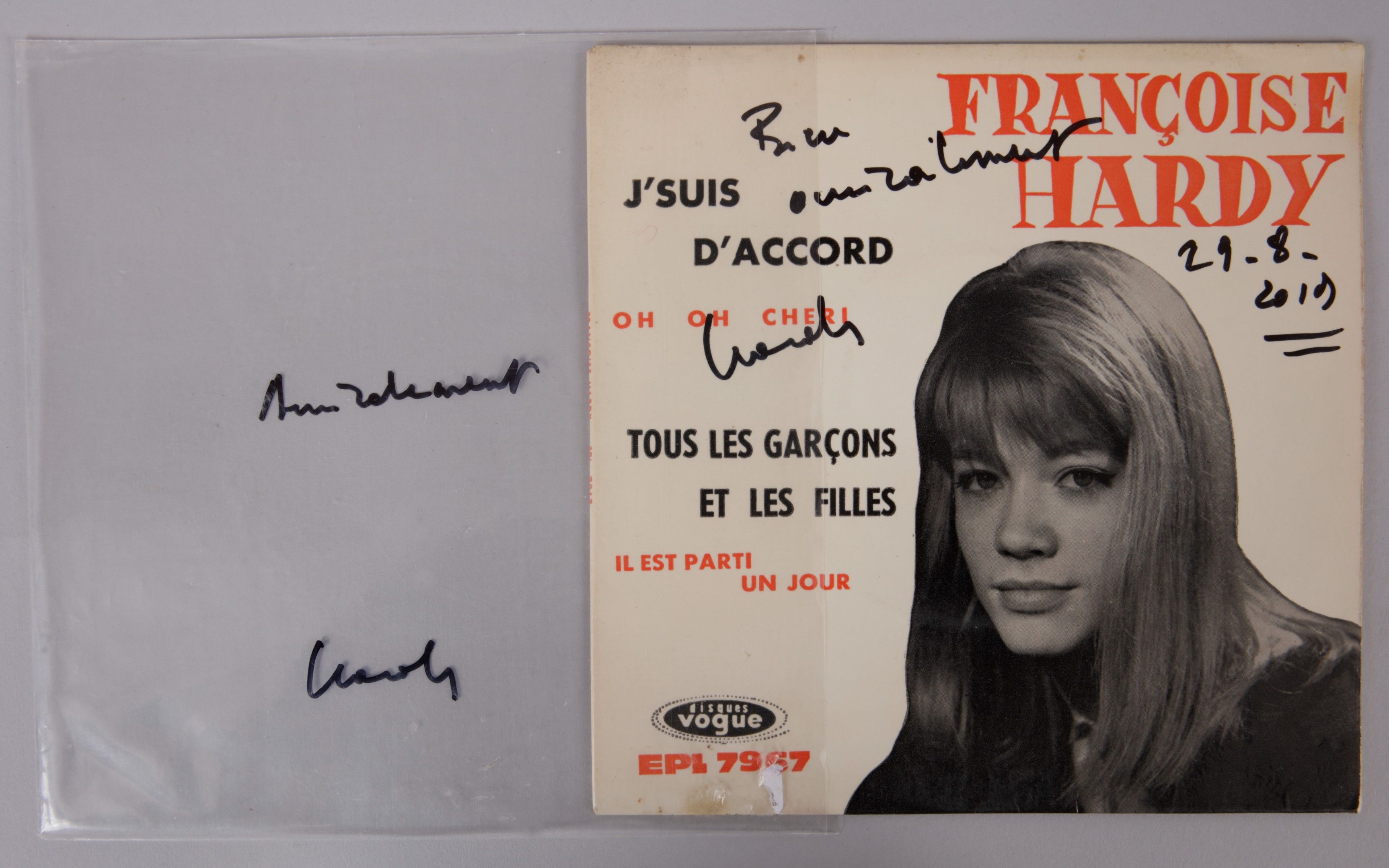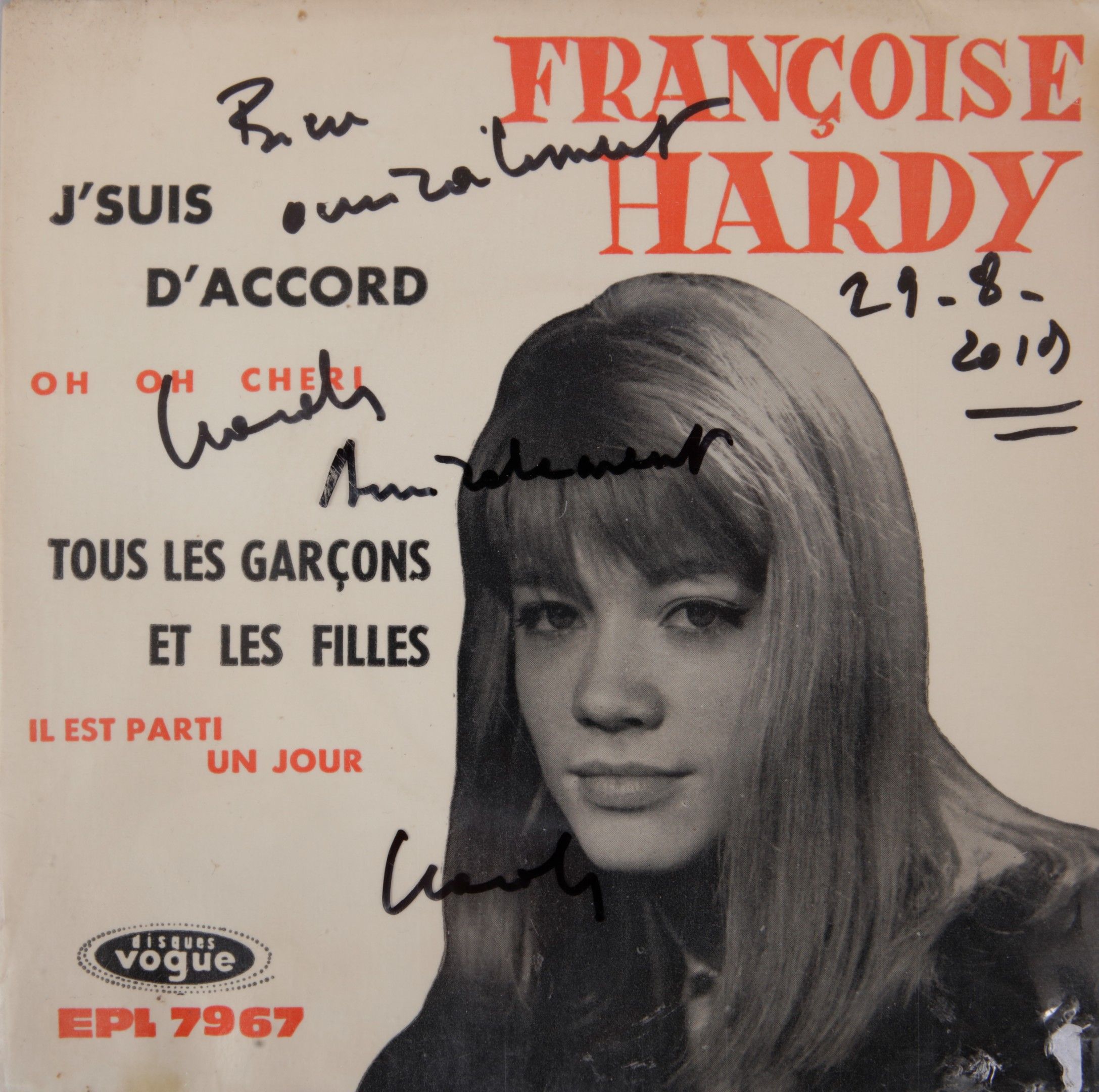 FRANCOISE HARDY (1944/2024) : Un disque original 45 tours vinyle « Tous les garçons et les filles » dédicacé par l’artiste à 2 reprises : sur la pochette du disque le 29 août 2019 et sur le protège-disque en plastique transparent. Bel état.