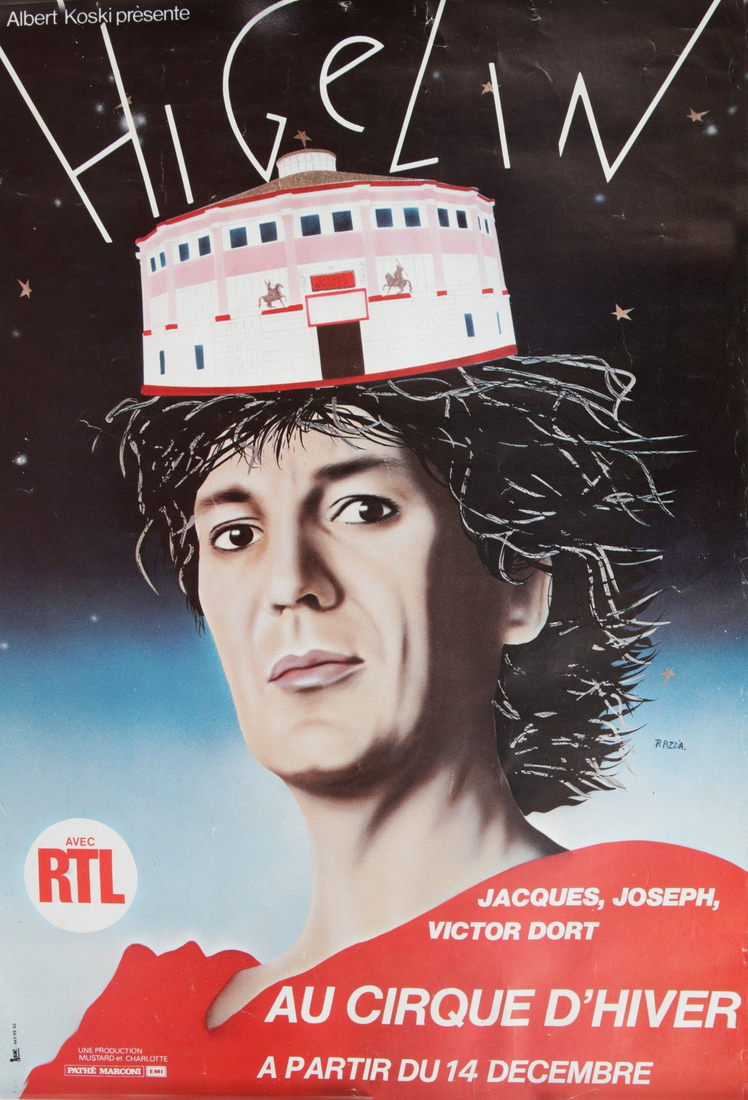 JACQUES HIGELIN (1940/2018) : Une affiche originale pour annoncer les concerts de l’artiste au Cirque d’Hiver de Paris à partir du 14 décembre 1981. Format 40x60 cm. Bel état.