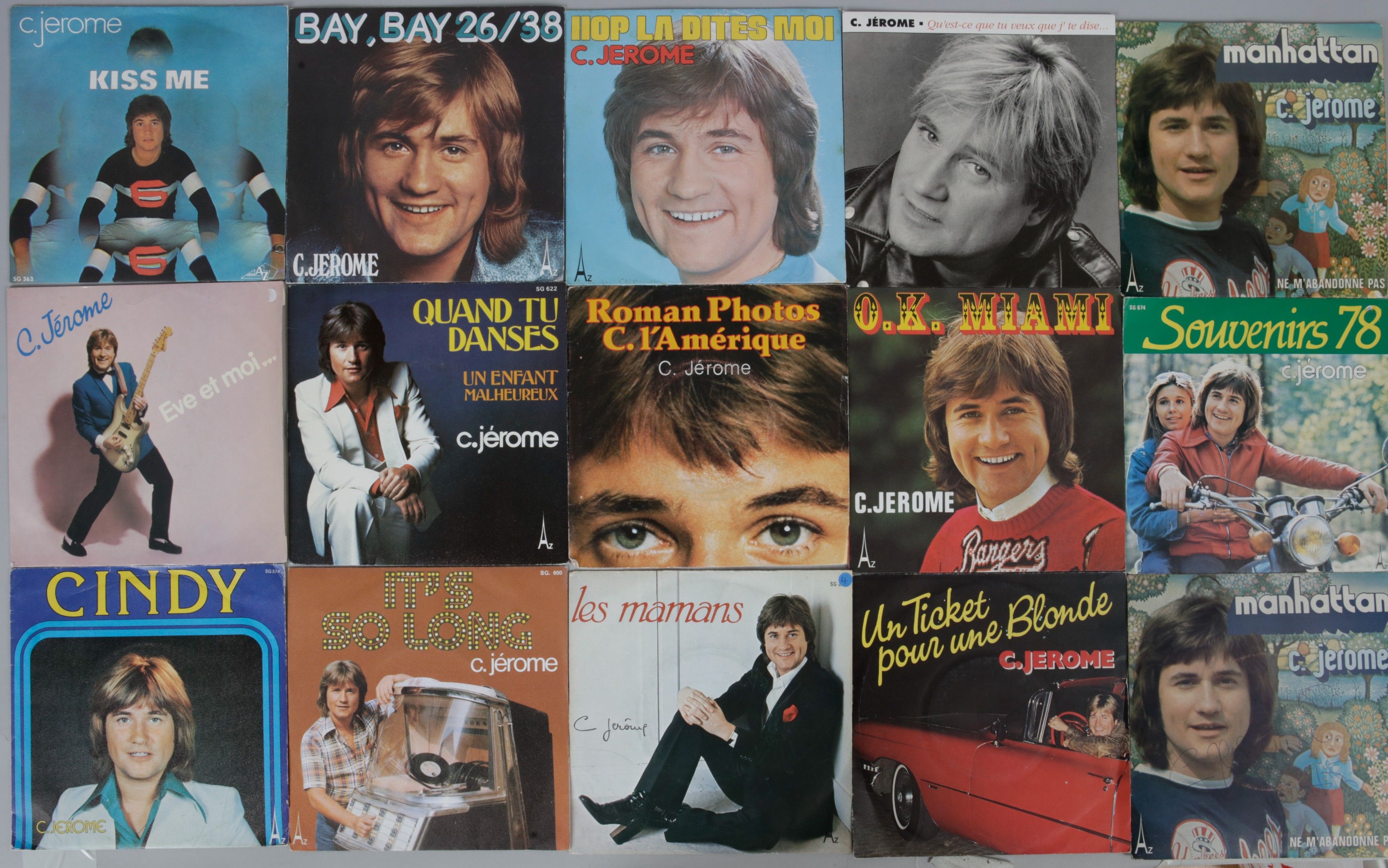 C. JEROME (1946/2000) : Un ensemble de 15 disques originaux 45 tours vinyle publiés entre 1972 et 1991, dont 1 disque est dédicacé par l’artiste.