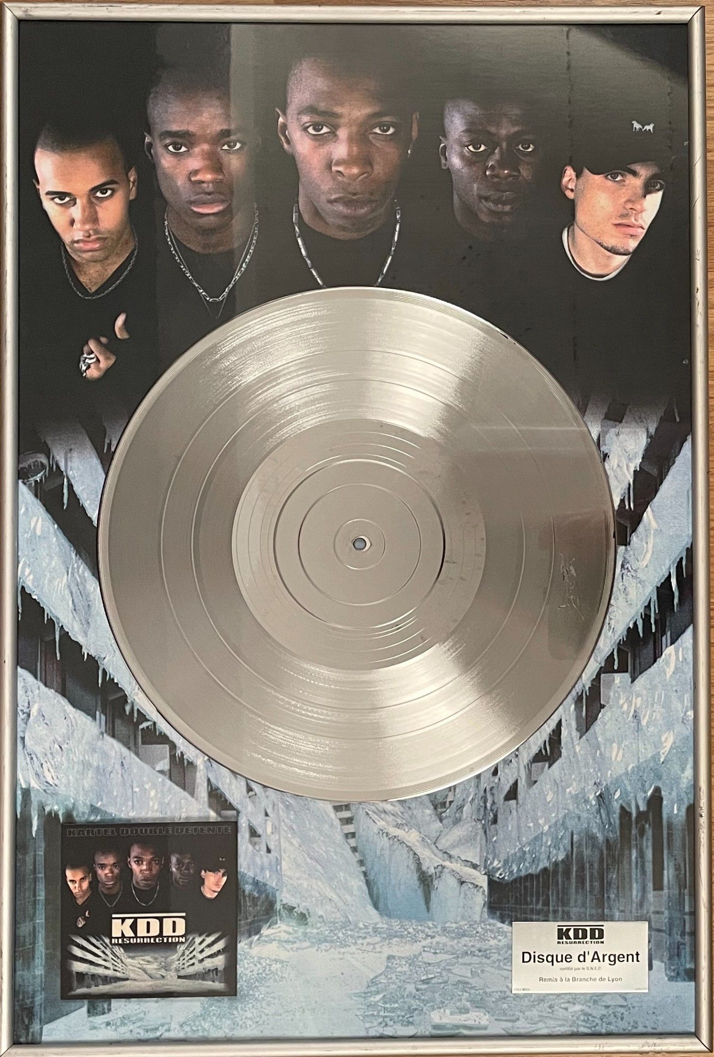KDD (KARTEL DOUBLE DETENTE) : Un disque d’argent du célèbre groupe de hip-hop français, pour l’album « Résurrection » vendu à plus de 25.000 exemplaires en France. Certifié Snep pour Columbia en juillet 1999. Format 41x61 cm. Bel état.