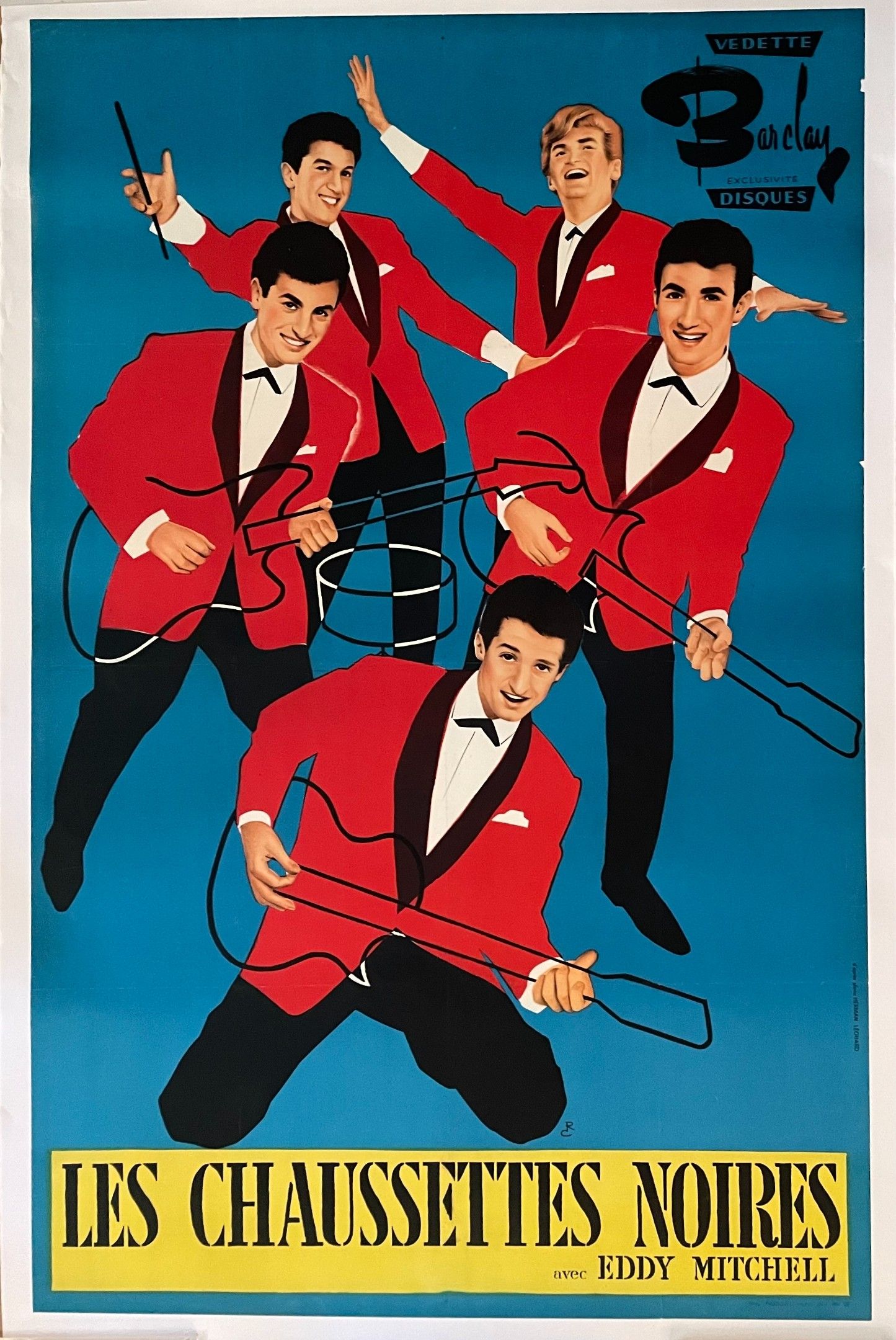LES CHAUSSETTES NOIRES avec EDDY MITCHELL : Une affiche originale du célèbre groupe de rock français. Formé en 1960 et composé de cinq membres : William Benaïm, Tony d’Arpa, Aldo Martinez, Jean-Pierre Chichportich et Eddy Mitchell. Format 76x120 cm. Affiche rare et entoilée.