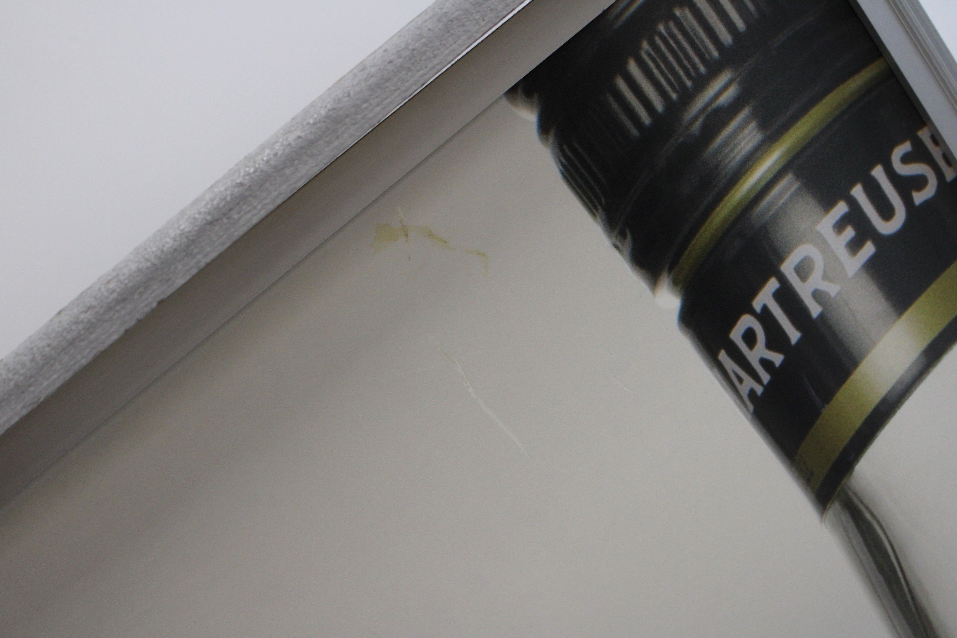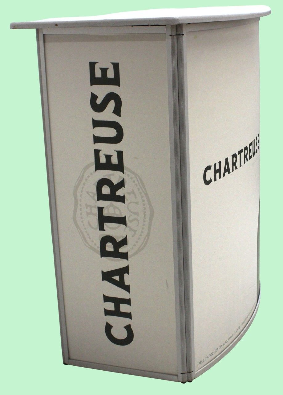 Observations : Présentoir à monter avec une étagère intérieure. Les trois faces présentent des publicités Chartreuse. Avec sa housse de transport