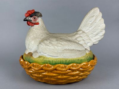OEUFRIER en forme de poule couvant en biscuit polychrome ave…