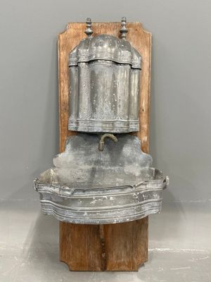 FONTAINE murale et son bassin de forme mouvementée, en étain…