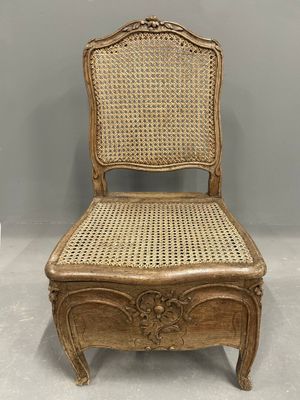 CHAISE d'aisance cannée en noyer sculpté de rocailles, feuil…