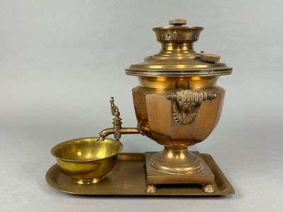 SAMOVAR en cuivre et laiton avec sa coupe, son plateau et un…