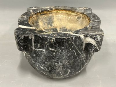 MORTIER à quatre ailettes en marbre gris veiné blanc.