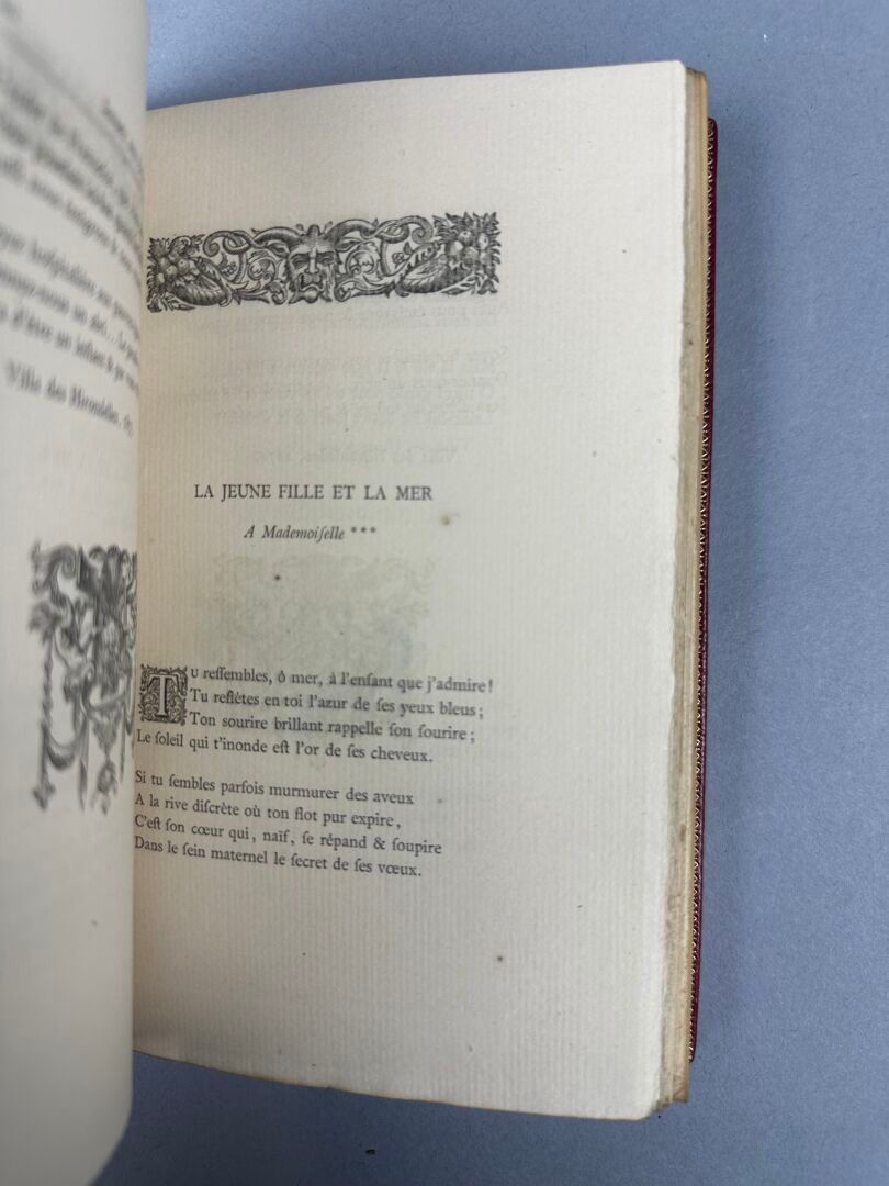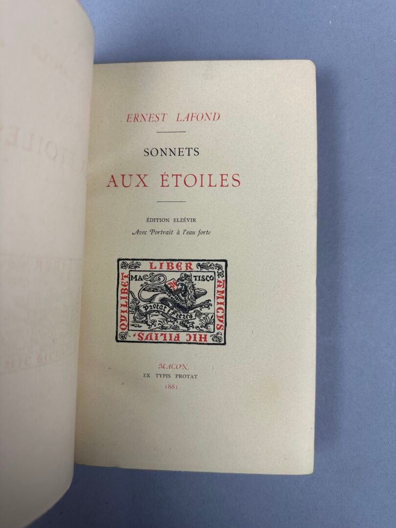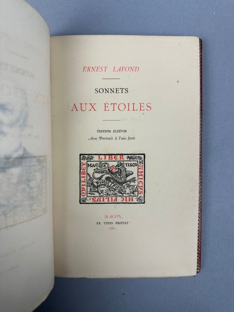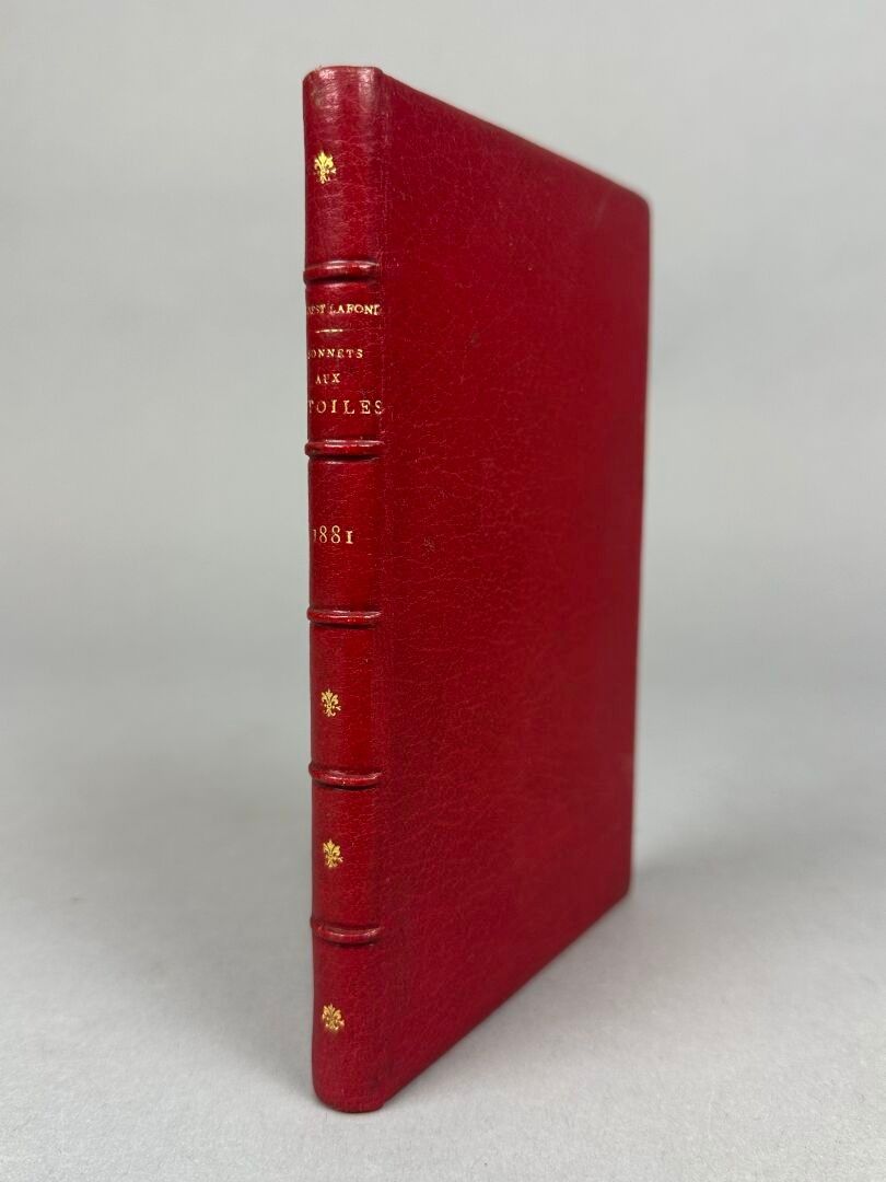 LAFOND (Ernest) - Sonnets aux étoiles. Édition Elzévir avec portrait à l'eau forte. Macon, Ex Typis Protat, 1881. 1 vol. in-12, pleine reliure maroquain rouge postérieure, couverture conservée. Édition originale. Ex-libris comte de Malherbe, exemplaire dédicacé « Pour la biliothèque de l'auteur. Hommage des imprimeurs. 1er janvier 1881. » Usure d'usage.